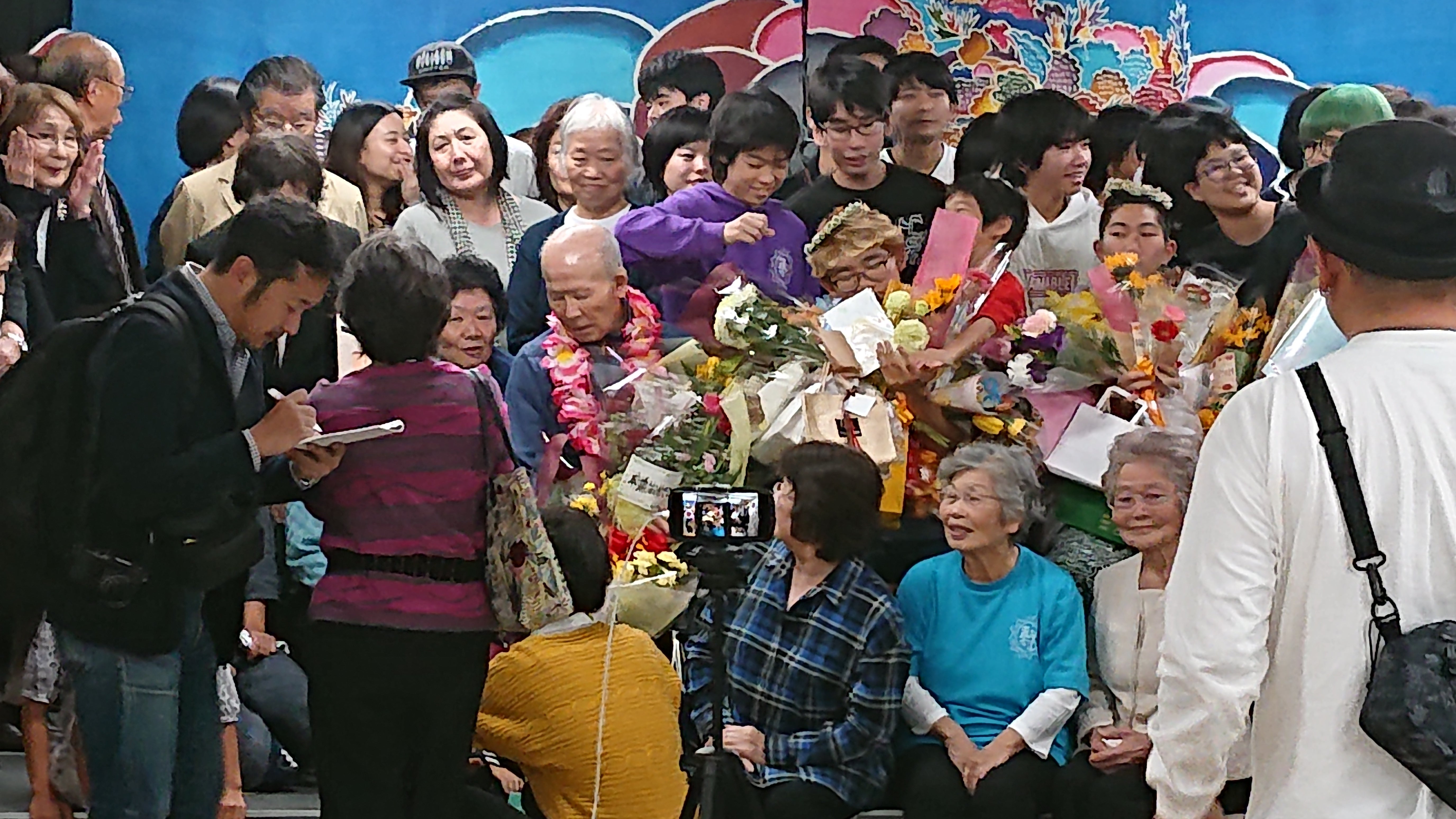 向日葵の前には10代の少女、戦争・貧困の為に学校に行けなかったおじぃ・おばぁたちが机を並べる。