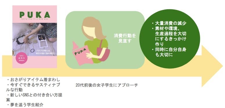 1人でも多くの人に”コンプレックスをコーデする雑誌”PUKAを届けて、同世代だからこその悩みを、私たちが吹き飛ばしたいです!そして、自分にも地球にも優しいサスティナブルファッションを普及し、同世代のファッションの消費行動に変化を与えたいです!