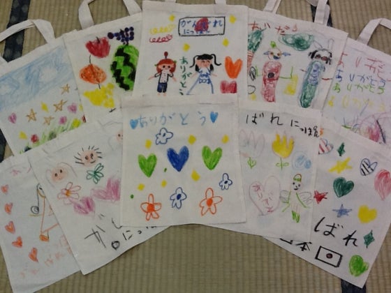 子ども達が絵を描いたエコバッグが出来上がりましたー!!