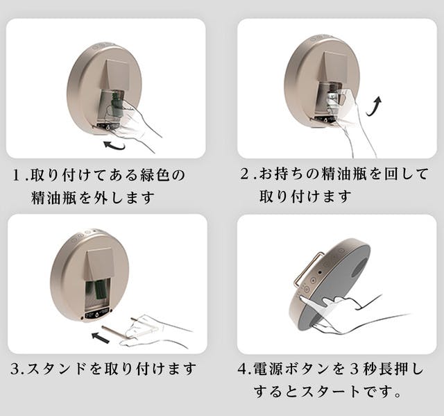 ※瓶の形が合わない場合は取り付けてある緑色の精油瓶に精油を入れてください。