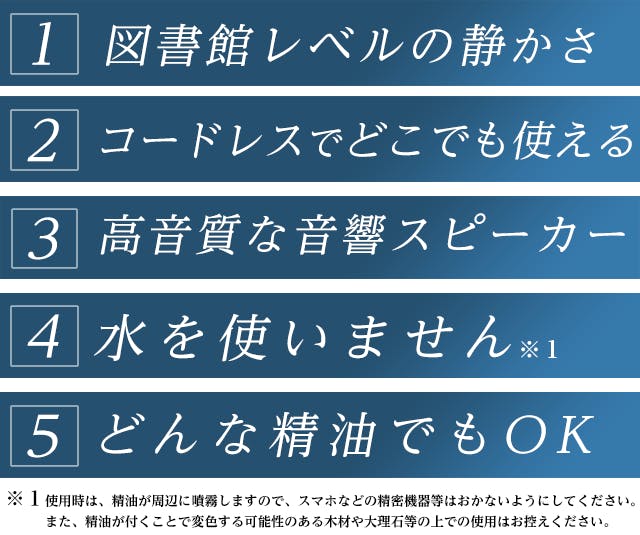 ※1 使用時は精油が周辺に噴霧しますので、スマホなどの精密機器等はおかないようにしてください。また、精油が付くことで変色する可能性のある木材や大理石等の上での使用はお控えください。