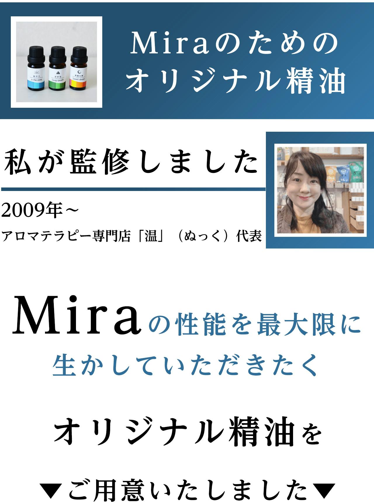 Miraは、アロマテラピーの専門家としてとても満足いくアロマディフューザーでした。熱を使わないので、精油の品質を落とすことなく、しっかりと香ります。しかもお手入れがとても楽。精油の種類やメーカーも選びません。アロマテラピーの知識がなくても、精油さえあれば簡単にアロマディフューザーが楽しめます。