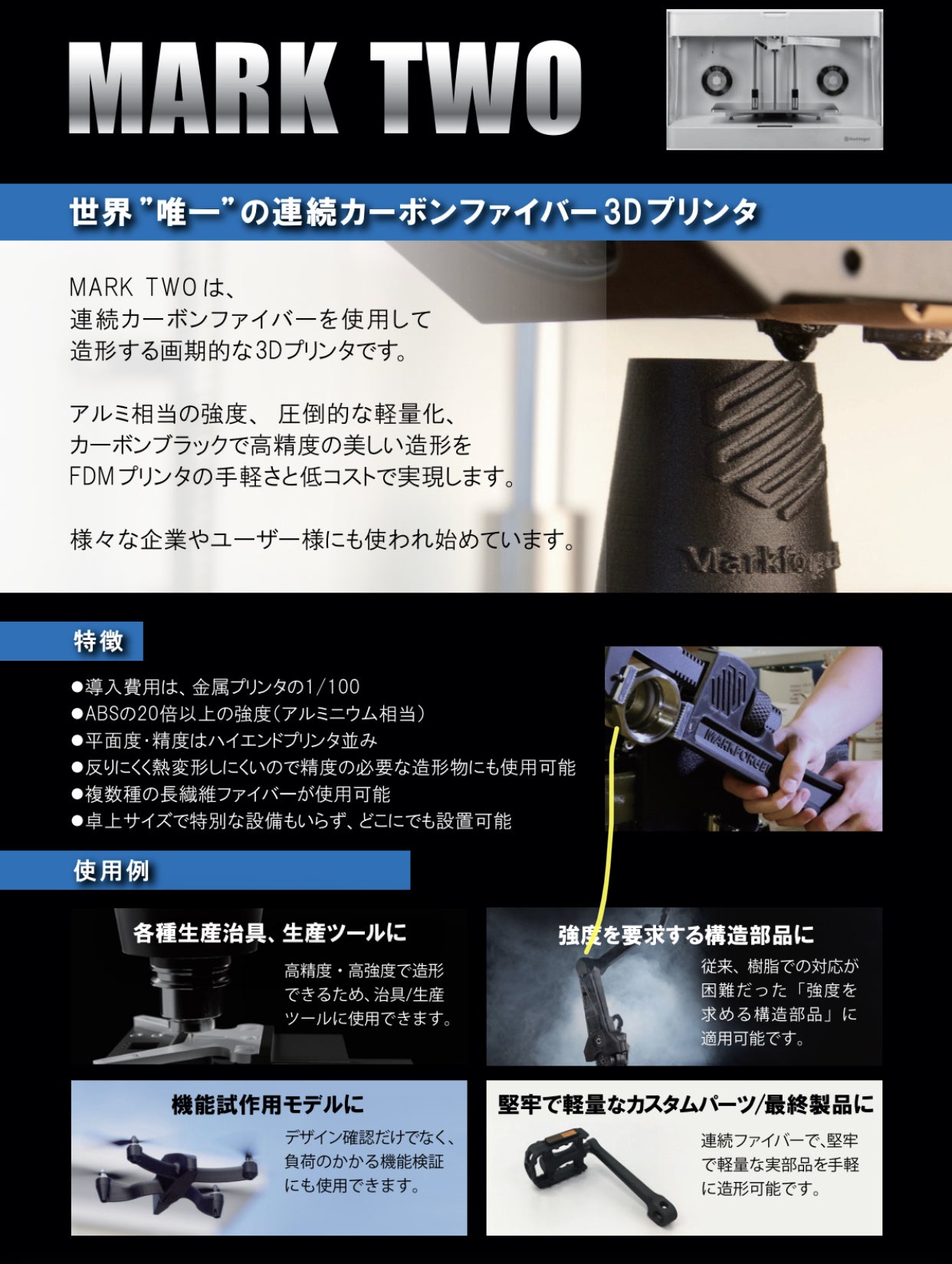 このプリンタは世界初のカーボンファイバー3Dプリンタで、圧倒的な強度と精度があります。