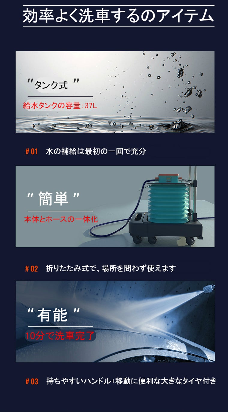 貯水容量37リットルで、面倒な水運ぶ作業がなくなります。取り付け方簡単、車1台で10分間位楽々洗うことが可能です!