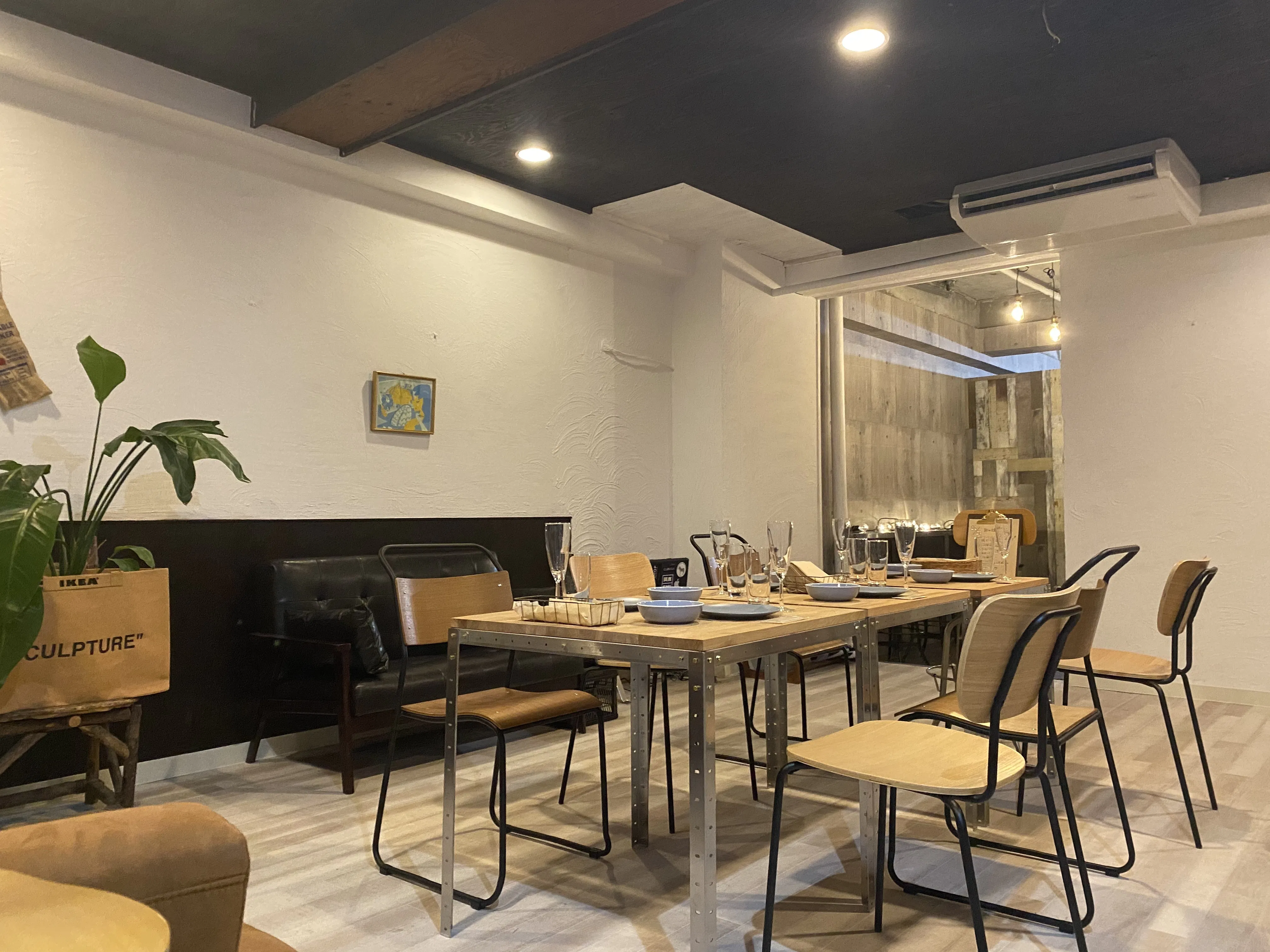 白を基調にした古さも残るちょっと小洒落たカフェダイニング、奥に進むと無機質なインダストリアルな雰囲気漂うフロア、そんなちょっと変わった店内になっております。