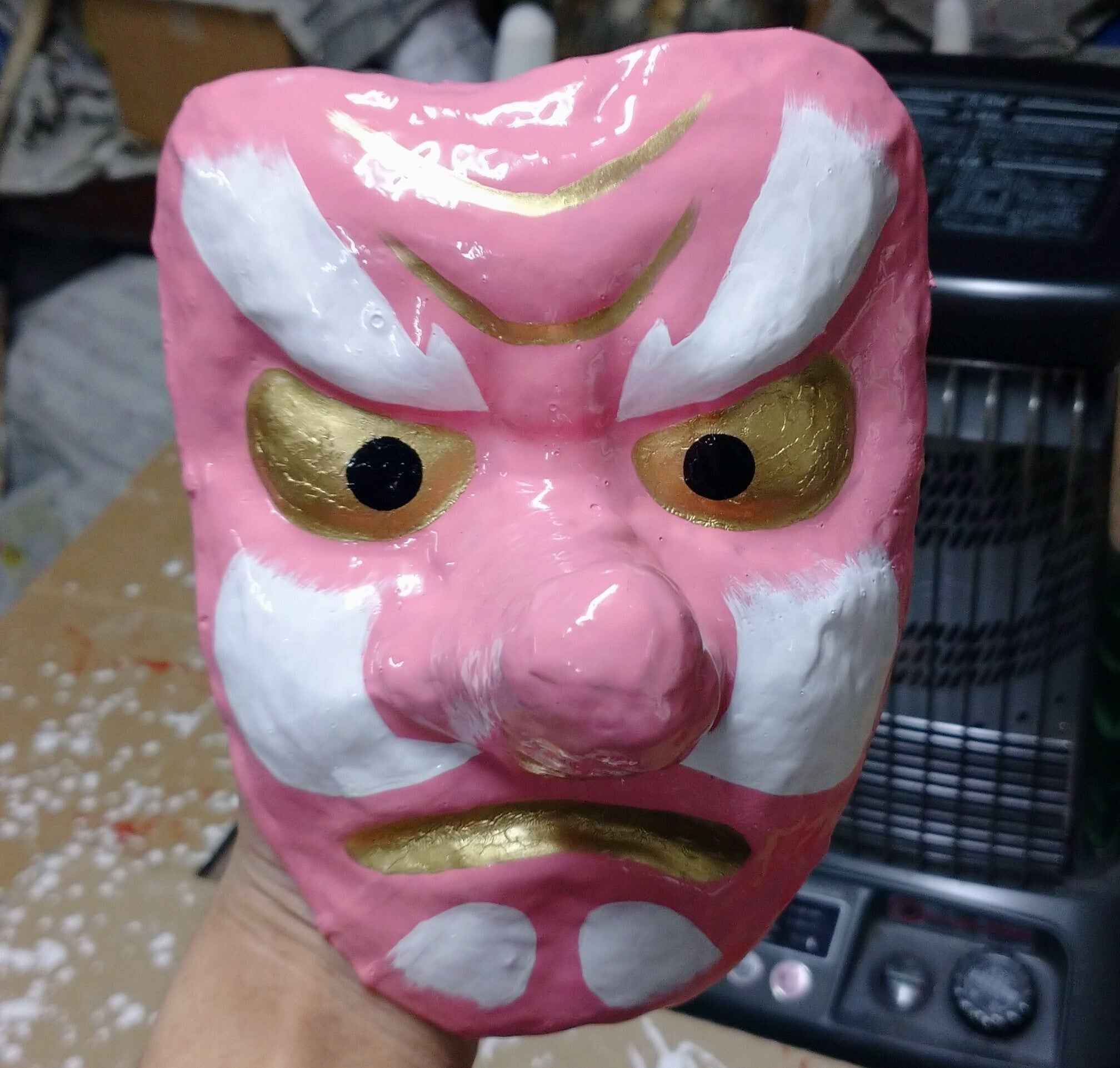 なんと!!昨日、ピンクの下地を塗った天狗面を投稿したところフォロワー様を通じて「岩下の新生姜」の岩下社長様からフォローを頂き、御支援も頂くという嬉しい出来事がありました!これはもう作るしかない!!と思い、今日早速完成しました!本来の髭は黒で描くのですが白を使用したピンクの天狗面!!中々、さまになってると思いますか?!このような御希望も喜んでお待ちしておりますので、御支援の程よろしくお願いいたします!!