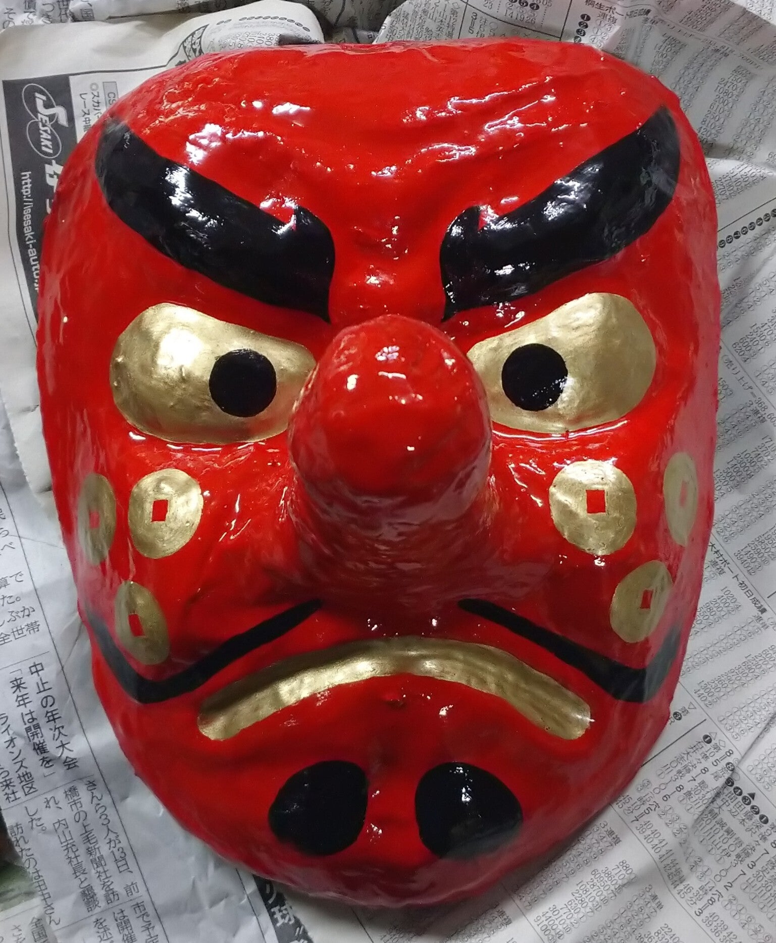 先日、ほっぺに六文銭を施した天狗面に顔を入れました!!元々の天狗面が勇ましい表情なので、もしかして戦国武将が頭に付けていてもおかしくないぐらいの出来になったと思いますがどうでしょう?!このようにリターンを頂ければリクエストは出来る限りのお応え致しますので、皆様からの御支援お待ちしております!!