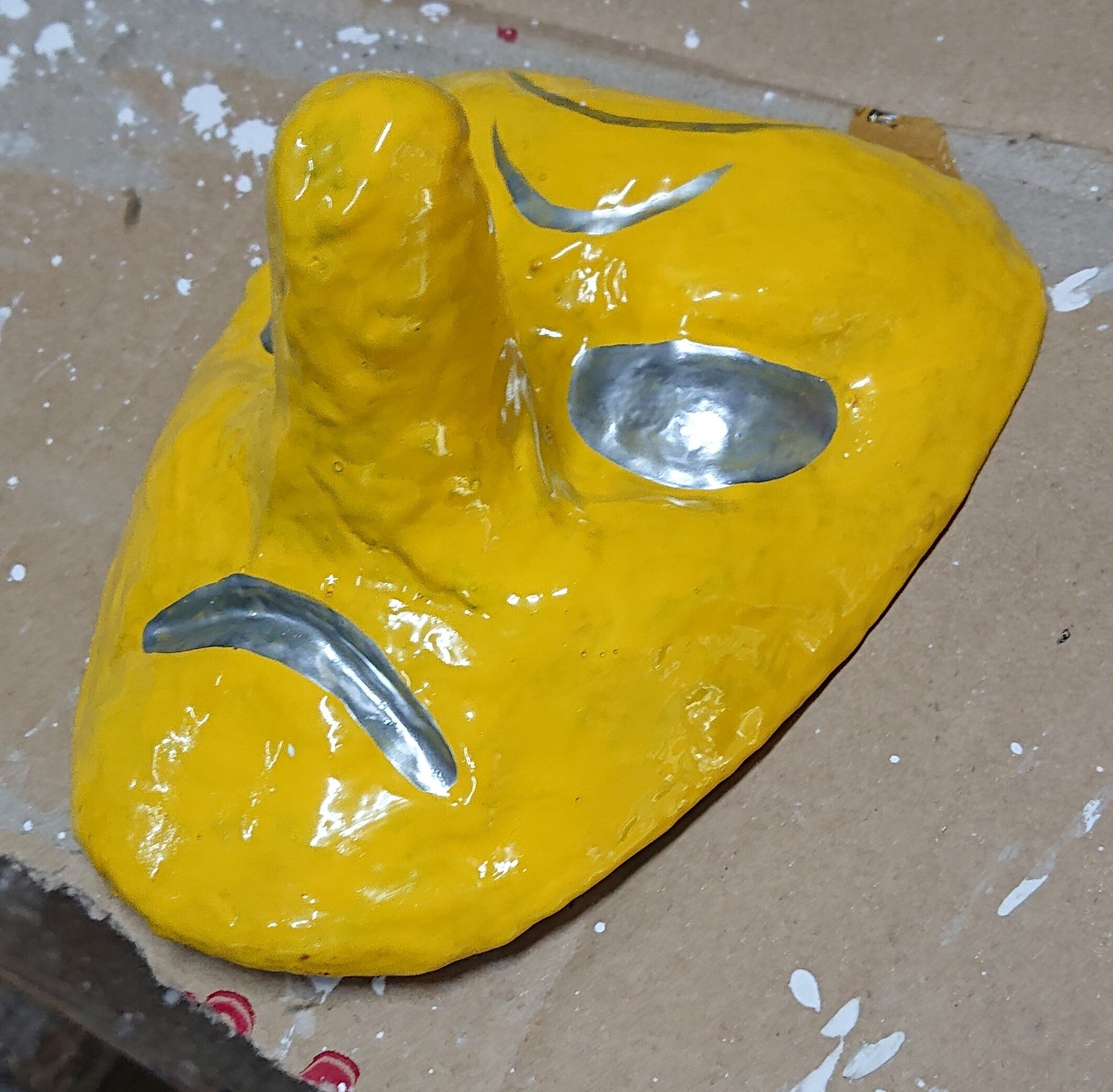 黄色のお面はこんな感じ?目を本来使用している金色をこちらも使おうと思ったのですが黄色と金色って見づらいよなと思ったので…どうでしょう銀の目!まだ目や髭を入れていないのでなんとも言えませんが、かっこいい天狗様が現れることを祈ります!!