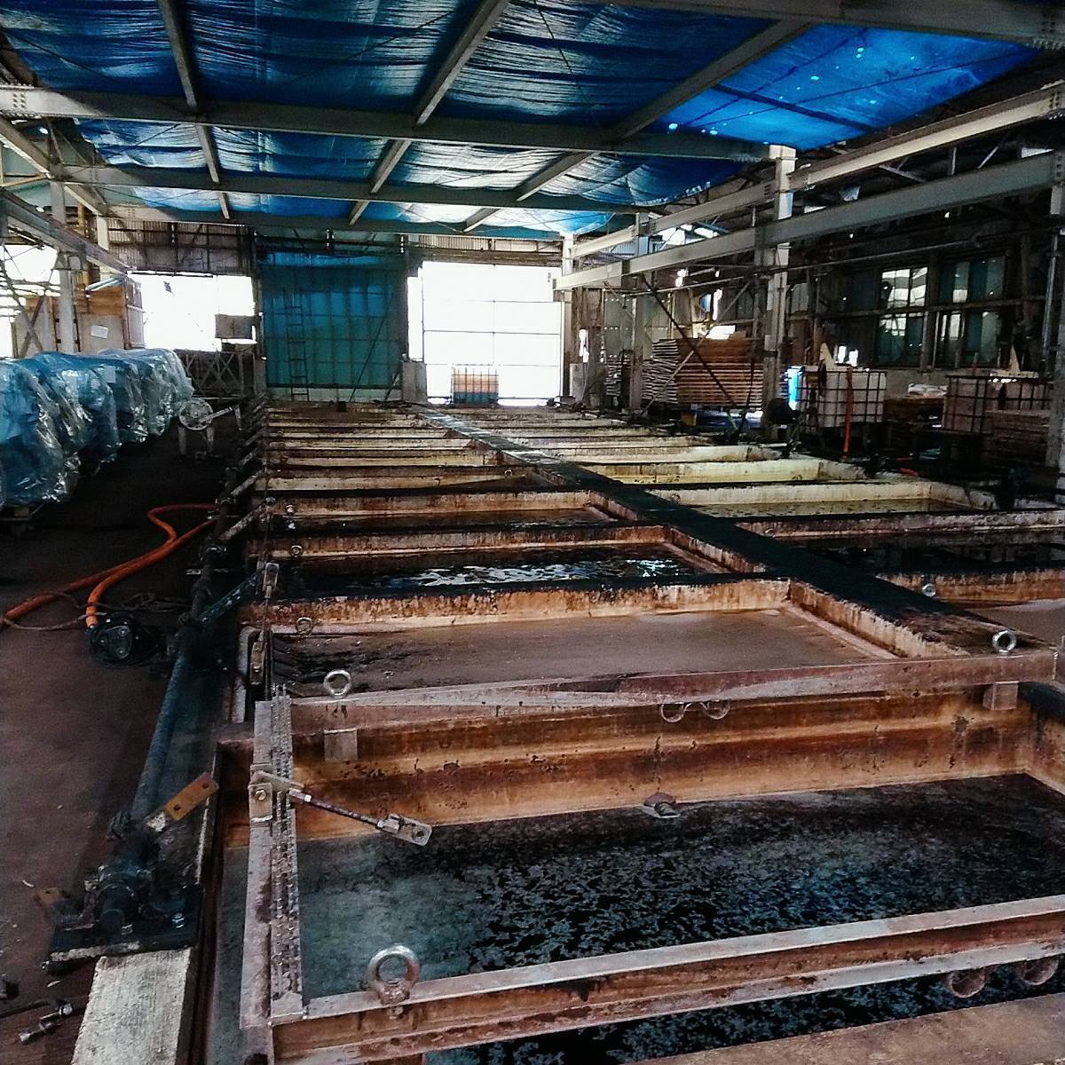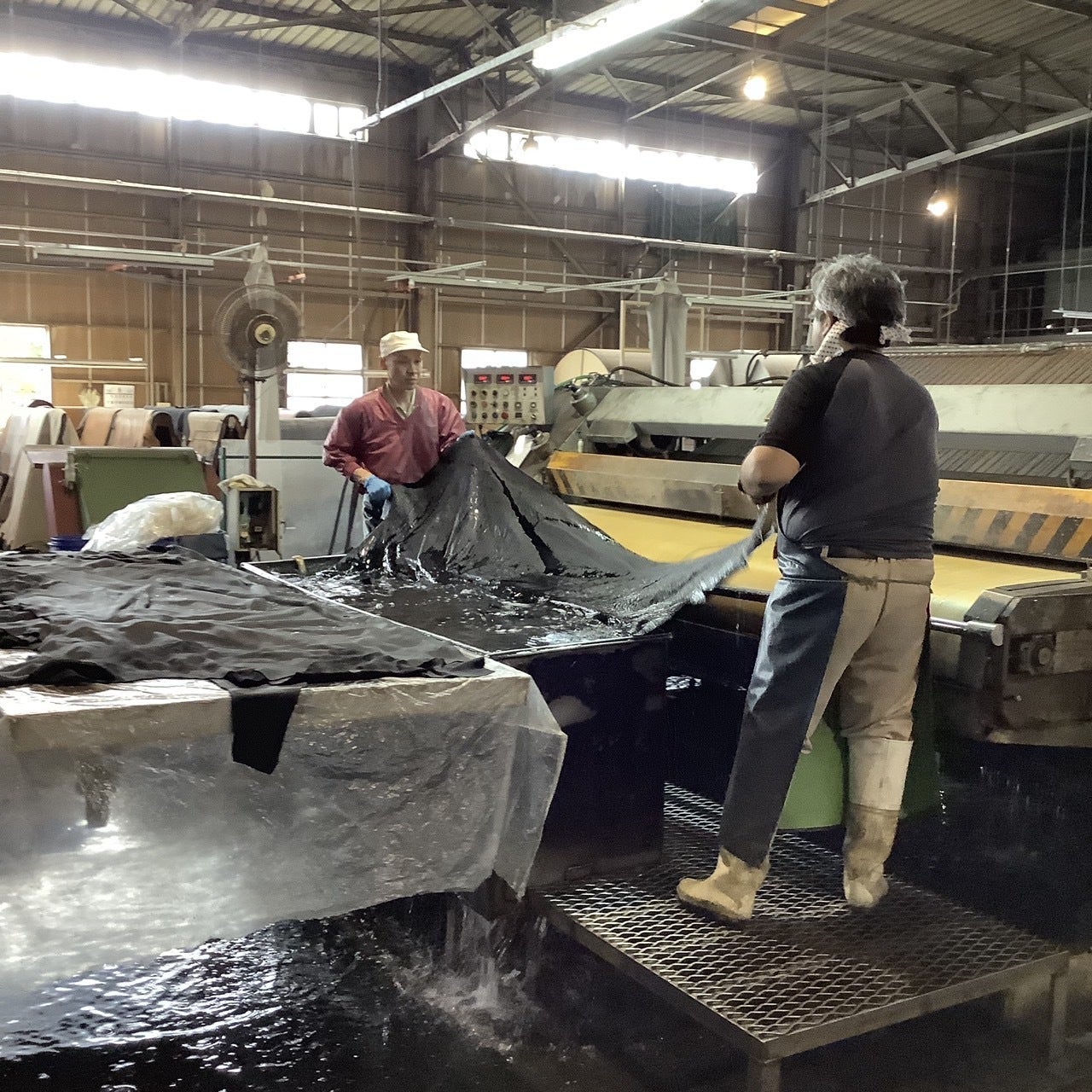 本来、動物の皮は固かったり、伸びにくい性質を持つため、素材としては扱いにくい状態です。これを革として使える状態にすることを「鞣し(なめし)」といいます。通常はドラムに入れて一日回して鞣すところを、株式会社山陽ではピットと呼ばれる槽につけ、約1ヶ月かけて鞣します。このピット槽は日本では数社しかなく、ピット槽で鞣された革は、一般的に高価なものとされています。ドラムに比べて皮への負担が少なく、時間をかけて鞣すことによって、堅牢度が高く、型くずれの少ない革に仕上がるのです。本物を長く使っていただくために、アウトドアショルダーには株式会社山陽のピット槽で鞣されたクラッシュレザーを採用しました。このアウトドアショルダーが、あなたの生涯のアウトドアライフのパートナーになりますように…。