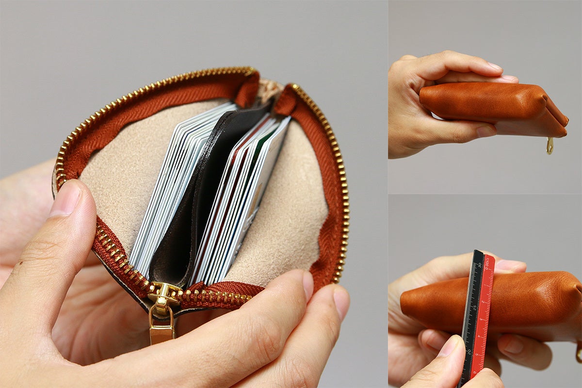 『お札・小銭・カード』すべての中身にワンアクションでアクセスできます。中身を詰め込んでも厚みは3cm程度。
