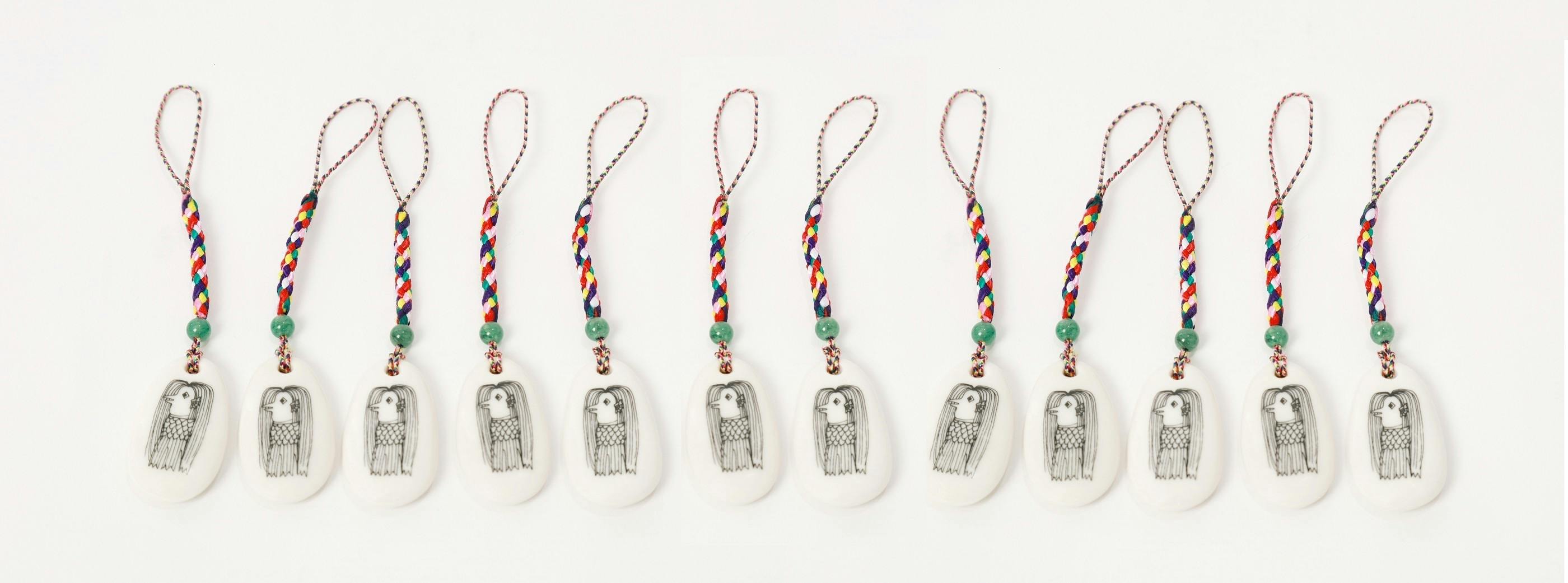 京焼の職人がすべて手作りで作り上げた磁器製の根付で、表面に「アマビエ」のイラストを描くとともに、裏面には魔除けの意味がある赤珊瑚色で邪気払いの梵字を配した根付で、厄除けの七色紐と五徳を高めると言われる翡翠を施しています。1230℃で素焼きするため、熱の当たり方で大きさや形が変わるほか、紐を通す穴も手作業で開けているため一つ一つ微妙に位置が異なるなど、完全に同一のものが存在しない唯一無二の品となっています。