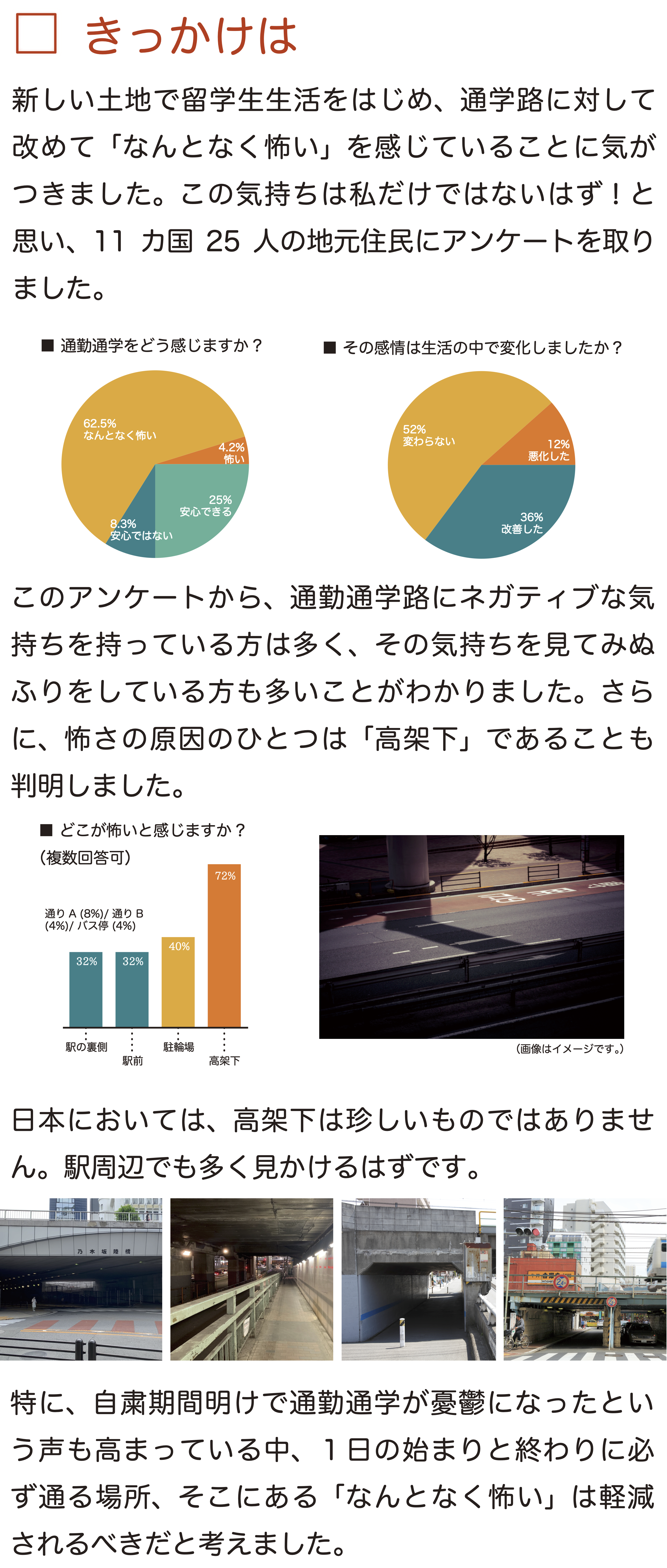 2020/11/13 03:32時間が開いてしまいましたが、ロンドンでの活動報告をいたします。クラウドファンディングは、皆様のご協力によって目標達成することができました。より一層気を引き締めて、デザインに取り組んでいく励みとなりました。ありがとうございます。現在は、前回のご報告通り、ロンドンでのプロジェクト実行にむけて、現場のリサーチとデザインの考案を進めております。今回は、一部にはなりますが、リサーチの内容と今後の展開をお知らせしたく存じます。場所はロンドン市内、地下鉄や鉄道、バスの往来が激しく、定住するという安心感を得られにくい街の高架下に注目しております。改めてデザインのターゲットを明確にするために、街頭インタビューに取り組みました。結果として、新しく移住してきた人々が都市に対して強い感情を持っていないことが、「ここが自分の地元ではない」と感じる原因であるのではないかと考えました。そこで、新しく移り住んできた人々をターゲットに、「ここに住んでいる」という安心感を作ることで、「なんとなく怖い」を克服できるデザインを提案しようと考えております。(赤=2年以上の居住歴 / 青=2年以下の居住歴)次に、何が居住感を高めることができるかのリサーチを行いました。そこで着目したのが、壁への落書きです。街中で落書きに注目して歩いてみると、おなじ人物が描いたのではないかと思われる落書きを見つけることができ、繋がりの希薄な都市の中で誰かの存在を感じることができました。さらに落書きに参加することは、その場所をコントロールしている感覚を得られるとともに、他者に対しての自分の存在の主張であるのではないかと考察いたしました。実際に人々が参加してくれる可能性があるのかを検証するために、高架下にホワイトボードを設置したところ、ロックダウンで人が若干減った街中でも多くの人が参加し、自分の痕跡を残すことに積極的なようでした。今後はこれらのリサーチをもとに、どのような筋書きで、人々を落書き参加させるのかをデザインし、実際に3月をめどにデザインの実行に取り組んでいきます。現在ロンドンは都市封鎖の状態で、まだ先が見えていない状態ではありますが、随時皆様に活動報告させていただきたいと思っております。お付き合いいただき、ありがとうございます。今後ともよろしくお願いいたします。 もっと見る