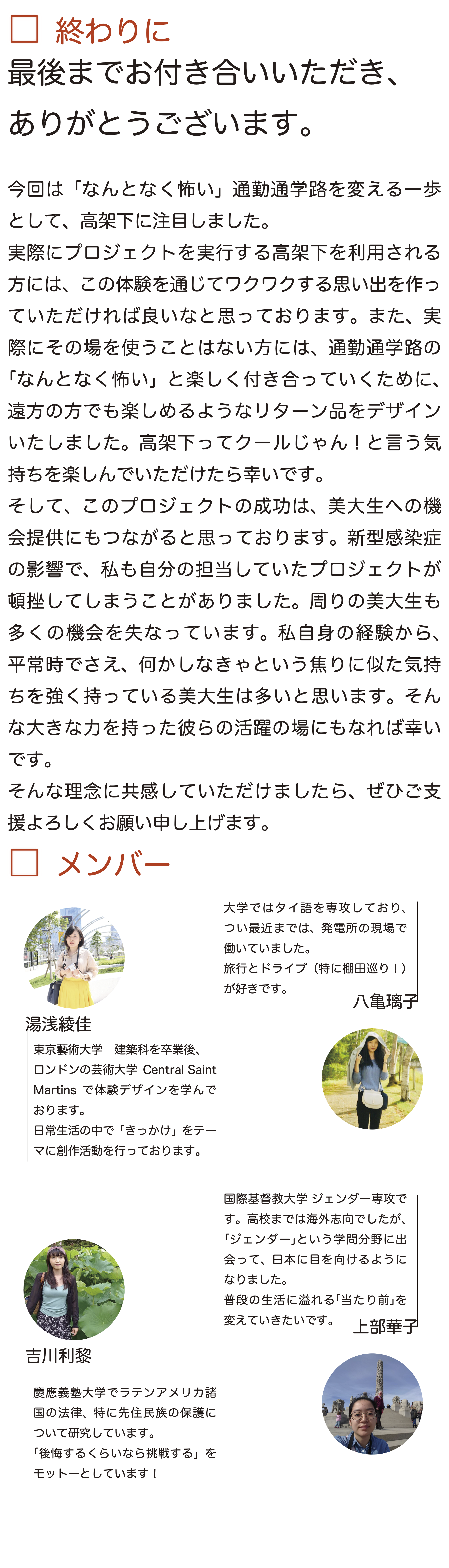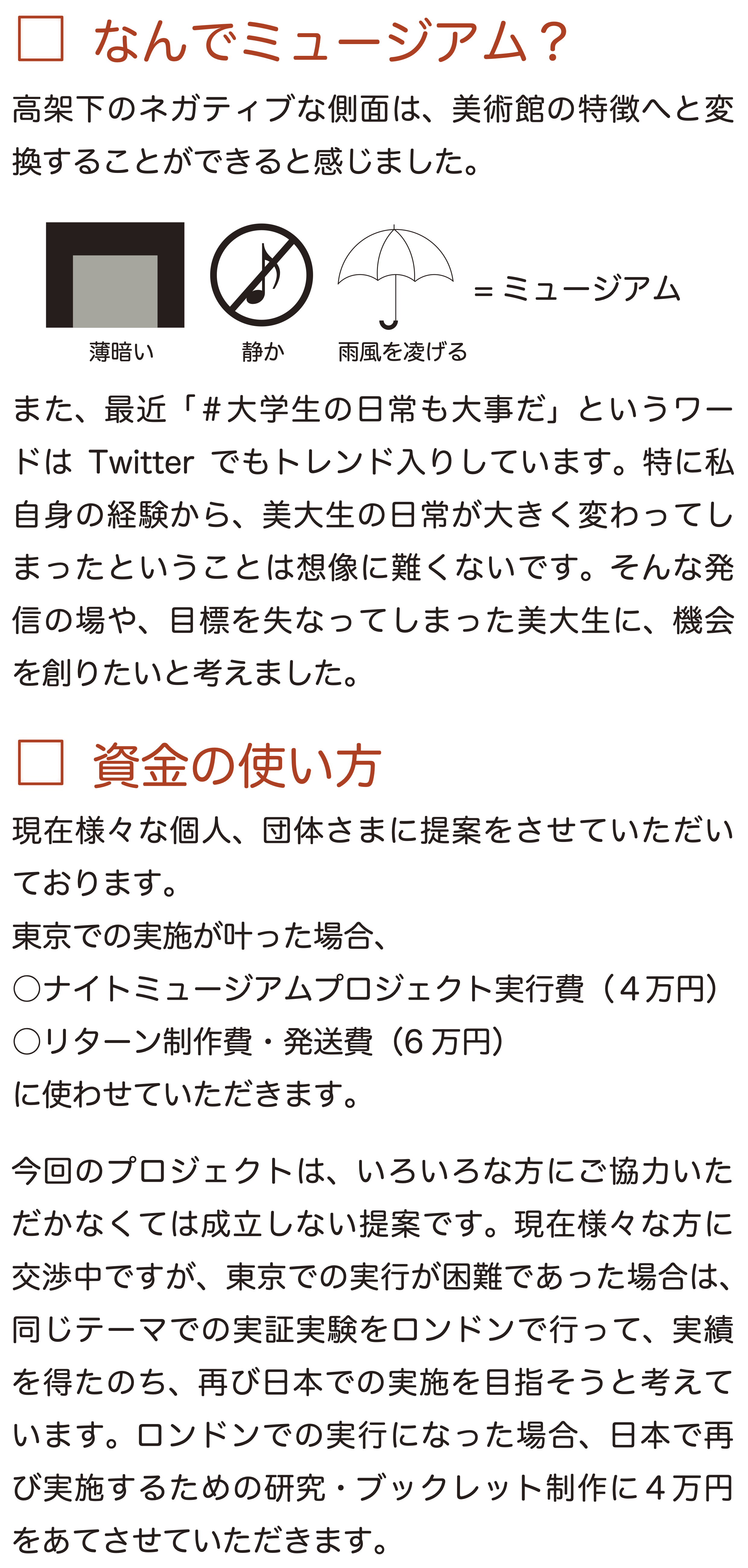 2020/10/05 13:21こんにちは。おかげさまで90%に達しました本プロジェクトですが、今回重要な報告がございますので、こちらにてご報告させていただきます。日本での実行を目指していた今回のプロジェクトですが、ロンドンでの実行をする運びとなりました。日本での実行に向けては9月より30以上の個人さま、団体さまに関わっていただき、お時間までいただきました。結果といたしましては、「高架下そのものや高架下にある公道を、個人に貸し出すことはできない」と言うことでした。これを受けまして、日本での実行は難しいと判断いたしました。一方、ロンドンでは、street partyの開催を個人で開くことが許可されており、公道でのアートイベントの開催への敷居が低いようでした。ウェブサイトも開設されており、どこに許可を申請すれば良いのかまでインストラクションが明確であったため、プロジェクトを確実に実行するためには、本文でのご説明通りロンドンで一度実行し、効果や安全性を証明できるようにしてから日本で再びチャレンジできたらと考えております。日本での実行を目指してご協力いただいていた方々には、大変申し訳なく、私の力不足であったこと悔しく感じております。しかし、ロンドンでの実行はプロジェクトとしてもデザインを練り上げより良い取り組みを展開し、日本にも影響を与えることができたら良いと思っております。いただいた資金は、リターン及び、場所(日本の高架下実測の交通費)・デザイン研究費、日本で再び展開するための成果報告のブックレットなど日本に還元できる部分で使用いたします。引き続きご支援のほど、よろしくお願いいたします。 もっと見る