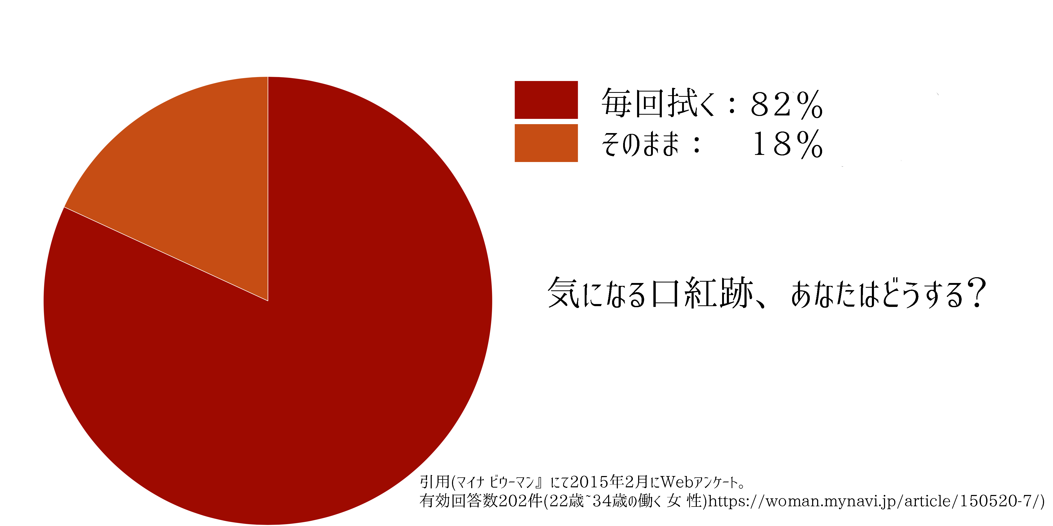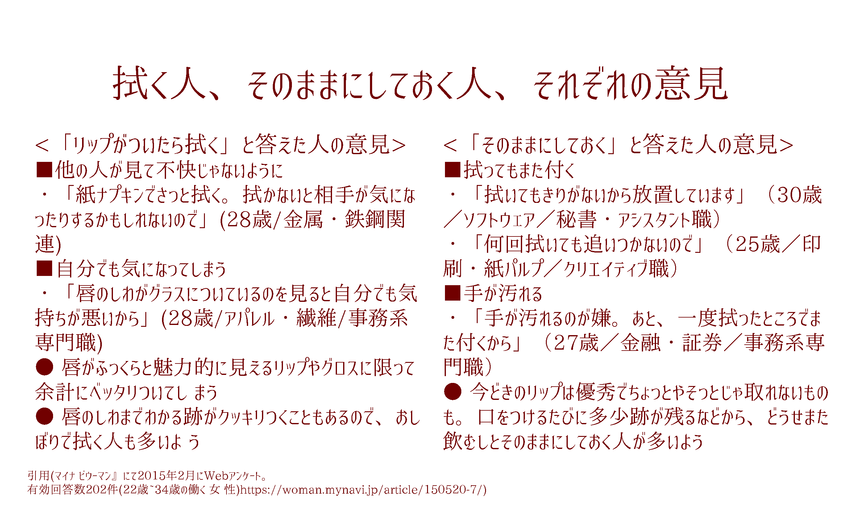アンケート調査の結果から、気になる口紅跡への対処法として「毎回拭く」という人の割合が8割を超えることがわかります。それに対して、約2割の人は「そのままにする」ということがわかります。それぞれの立場から以下のような意見が挙げられました。