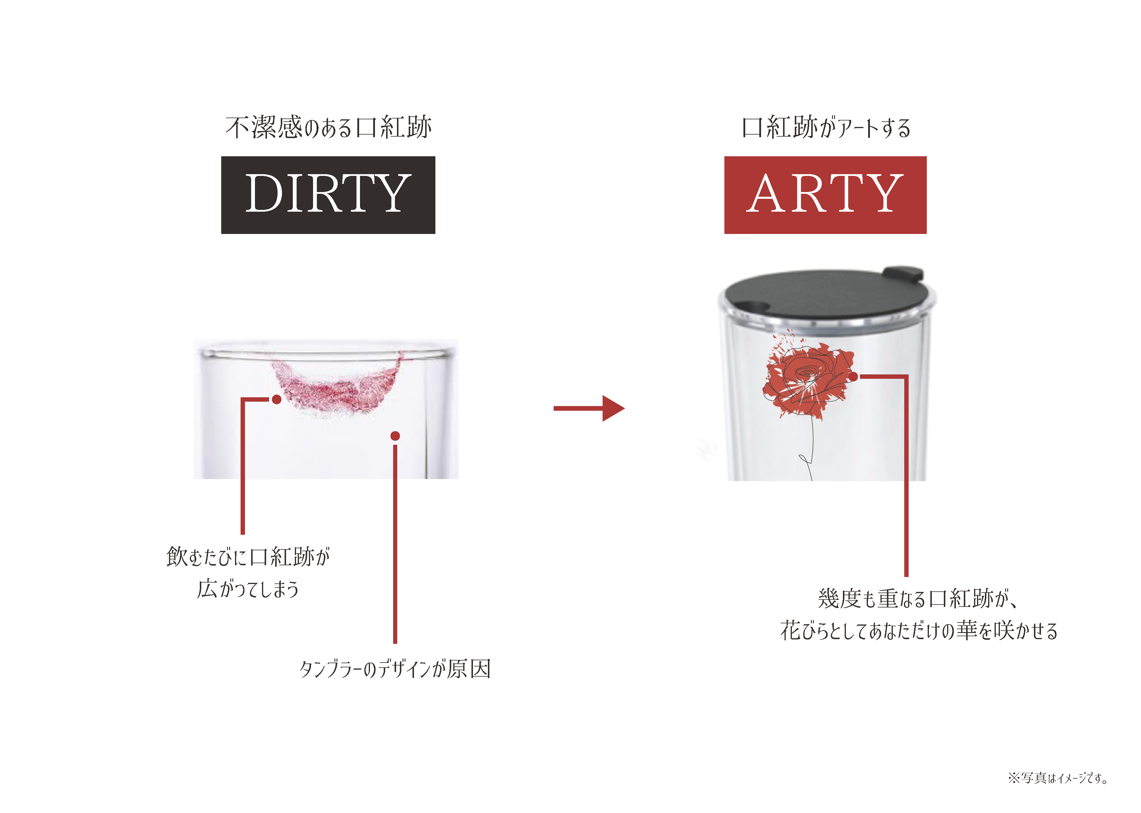 そんな思いから、モヤモヤのもとである口紅跡をデザインとしてプラスするタンブラーを考えました。