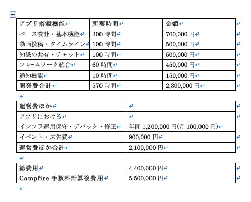 開発会社とともに、アプリ開発に関する見積もりを行い以下を算出致しました。