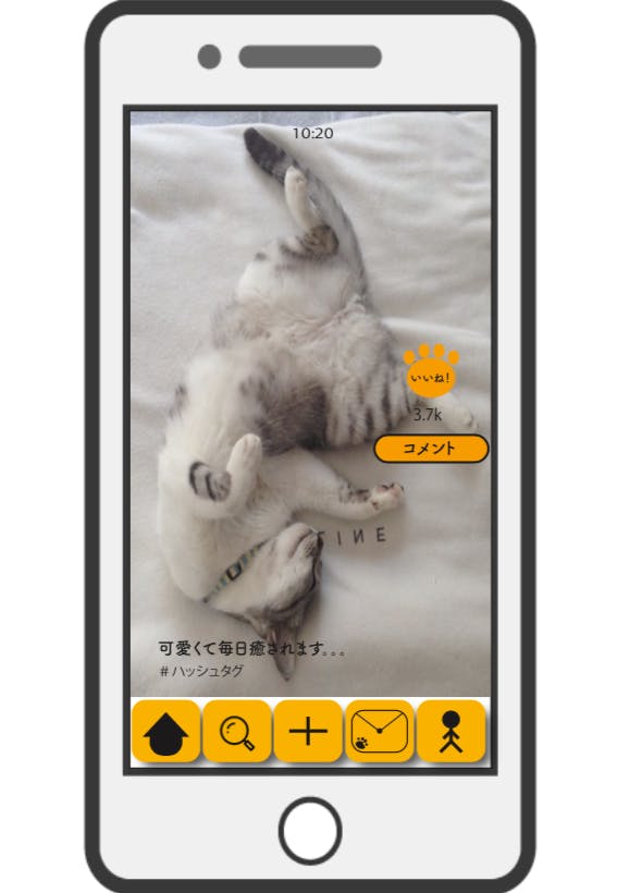 スマートフォンのアプリケーション(iOSとAndroid)を通して、すべてのユーザーに猫の存在をより身近に感じてもらうことが狙いです。このアプリは猫の動画・写真共有がメインの新しいSNSです。ユーザーは、オンラインで不特定多数の猫の動画・画像を視聴でき、飼い主であれば飼い猫の可愛さを気軽に発信できます。以下のように画面全体に動画が表示され、直感的な操作で様々な動画に移り変わっていき、視聴することができます。また、猫の顔をAIが認識して画面上で被り物や洋服などを着せてあげ、更なる可愛さを演出することも可能です。