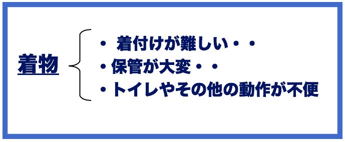 このような人々の中にある着物特有の問題も、着物が売れない原因となっているのではないか。
