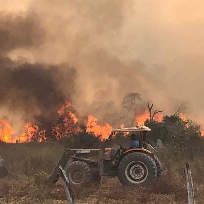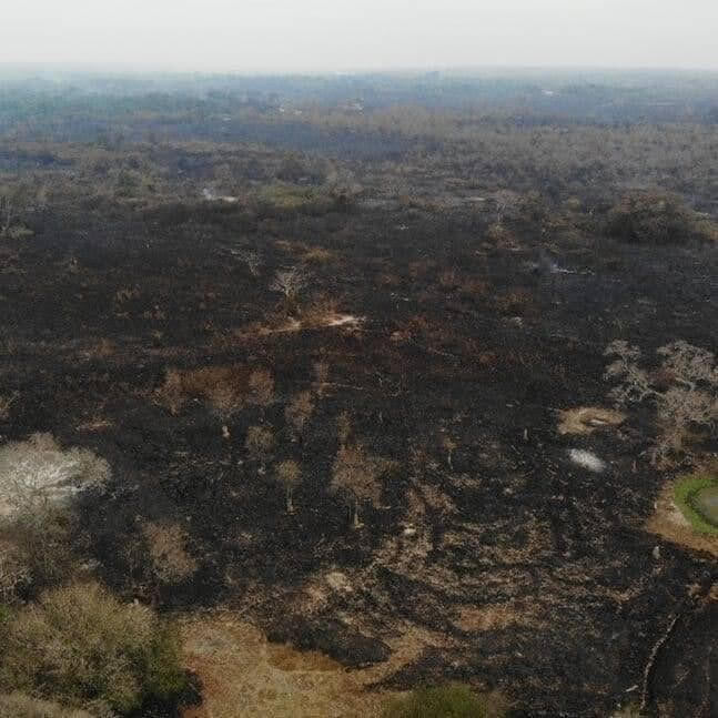 燃え続けるパンタナール_湯川氏提供 消火活動に明け暮れていた8月19日(水)、一本の心ないマッチ(放火)により現地在住日本人・湯川氏が管理する約800ヘクタール(3.0kmx2.7km、東京ドーム170個分)の敷地がほぼ全て焼失しました。