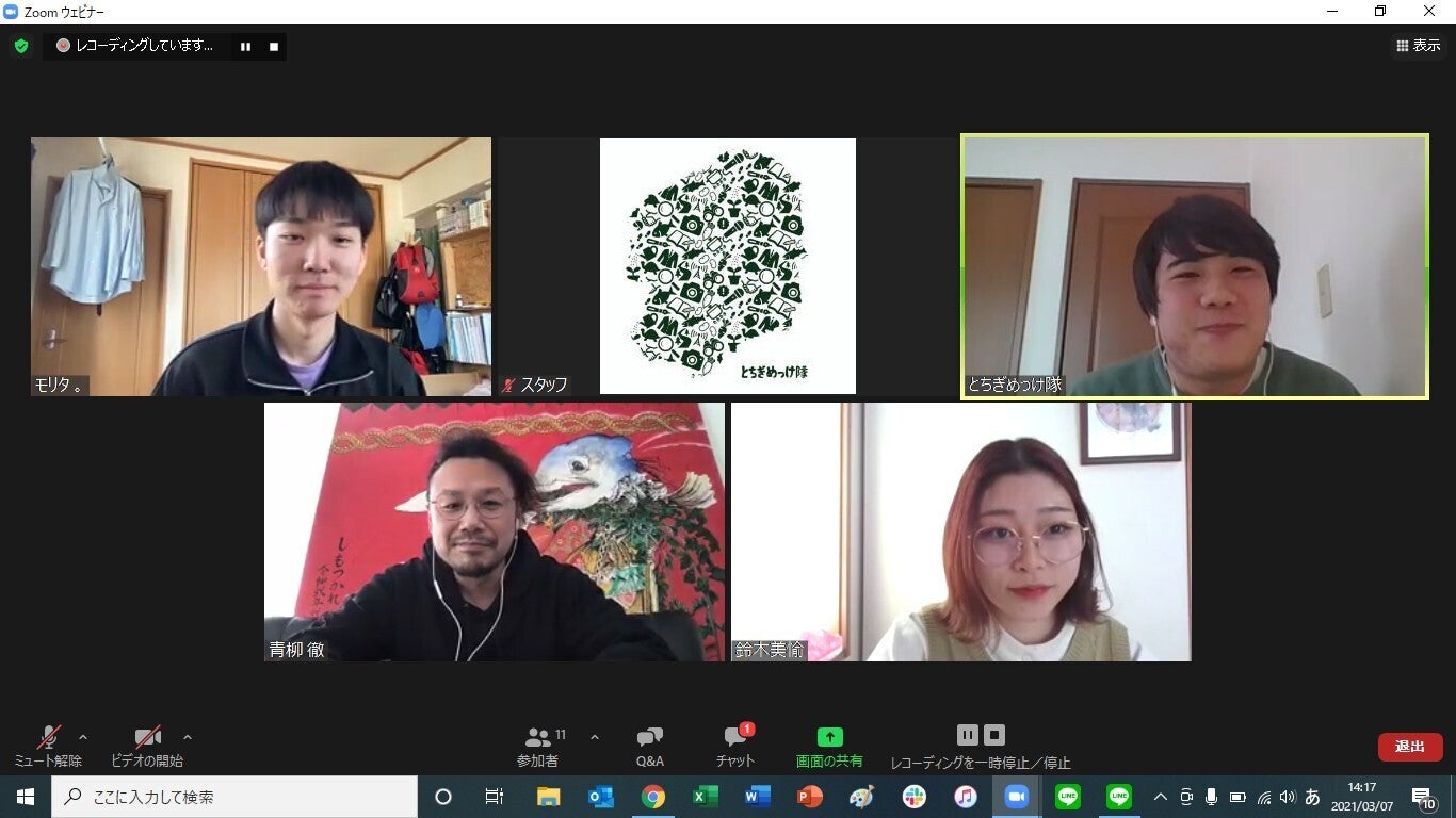 2021/07/23 14:582021年3月7日(日)にZoom上でオンライン活動報告会を行いました。とちぎめっけ隊に参加した高校生と取材させていただいた仕事人をお招きし、栃木のこと、仕事のこと、将来のことをざっくばらんに語り合いました。高校生たちは、事前に仕事人紹介のスライドショーを作成し、当日、画面共有機能を利用し発表しました。栃木の仕事人からどんなお話を聞き、何を感じたのか、共有しました。高校生のプレゼン発表のあとには、仕事人の方にも登場していただき、取材振り返りのトークも実施しました。また具体的に栃木で働く・生きるイメージを掴んで貰うために、「人生年表」の作成を行い、その内容について発表しました。1年後・3年後・10年後、自分はどこで何をしていたいか。そのためになにが必要か。何が課題なのか。人生年表の発表後は運営側の大学生と共に、今後の人生についてフリートークを行いました。報告会は大成功を収めることができました。お忙しい中、出席してくださった話し手の皆様、また話し手紹介のスライドや人生年表の作成、発表の練習をしてくれた高校生、誠にありがとうございました。 もっと見る