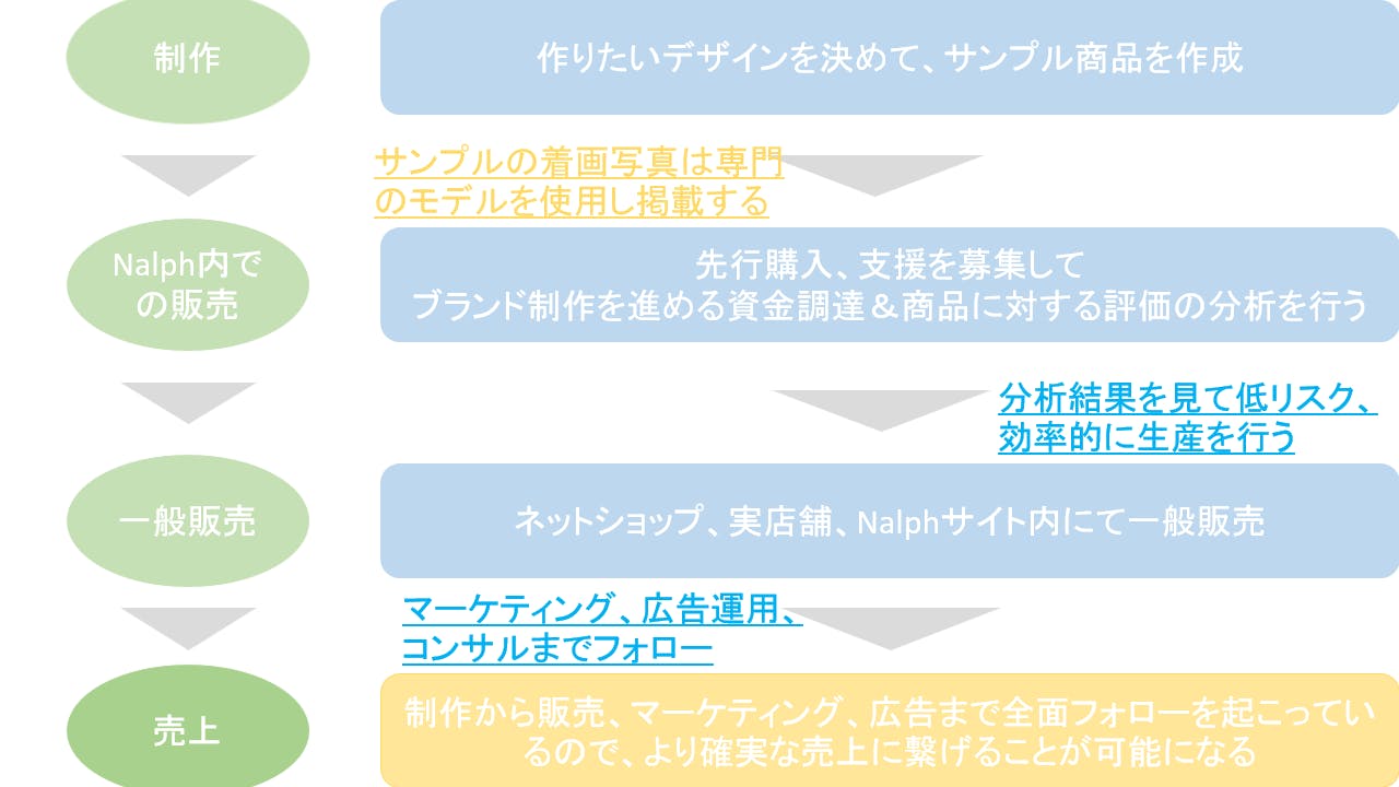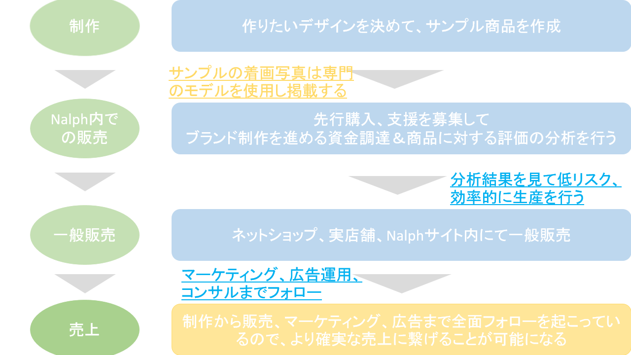 本来のマーケティングならここである程度のお金が必要となりますがその費用はクラウドファンディングの支援や先行購入での売上の中で行うため、ブランドを作りたい方の経済的負担を減らすことが出来ます。