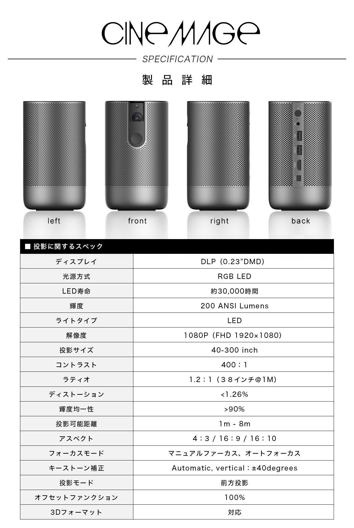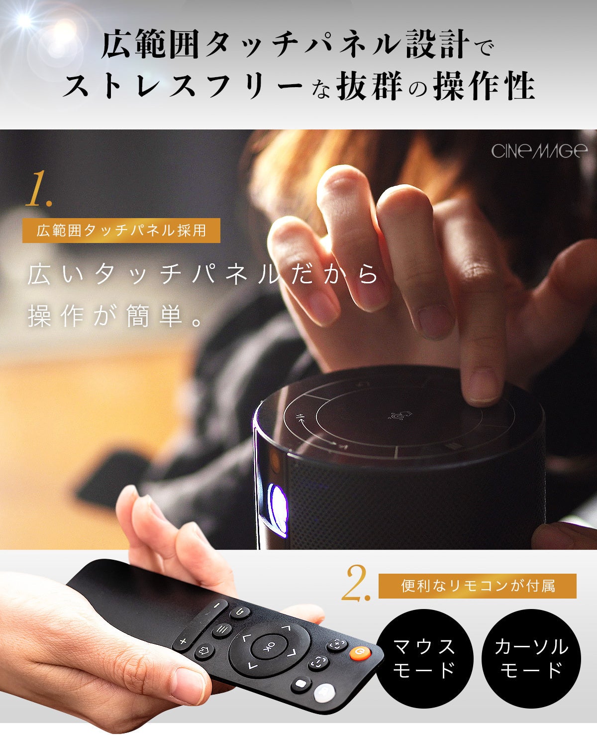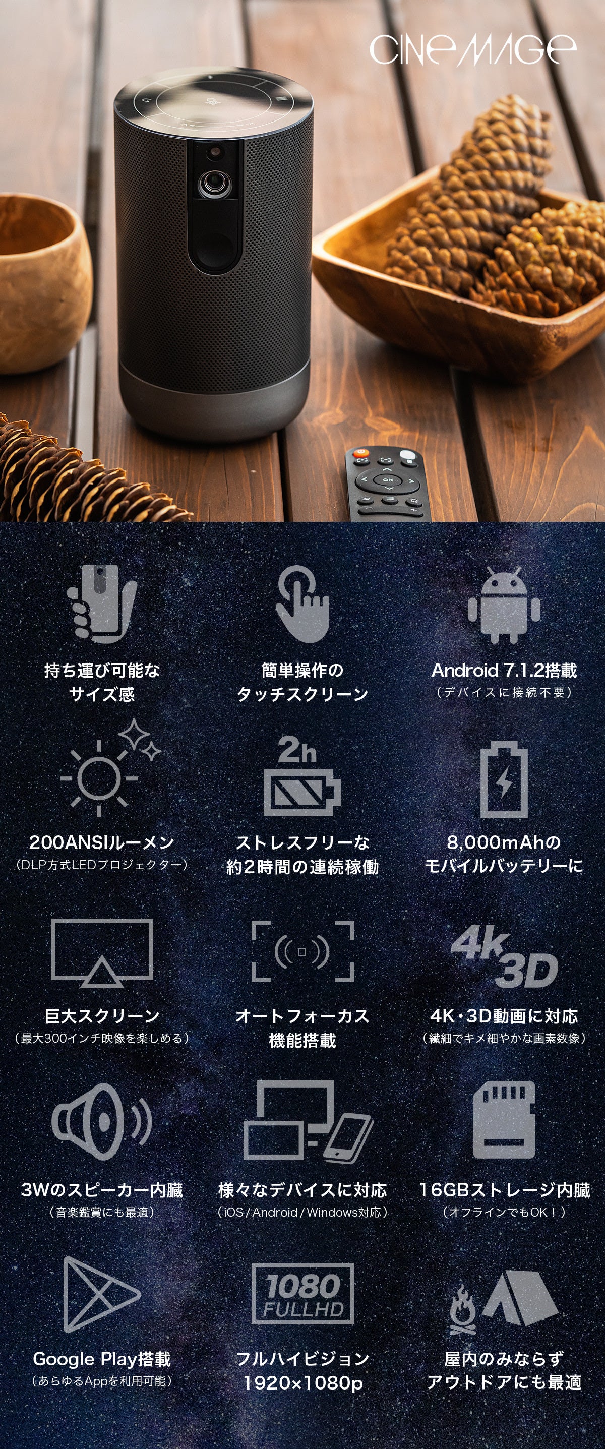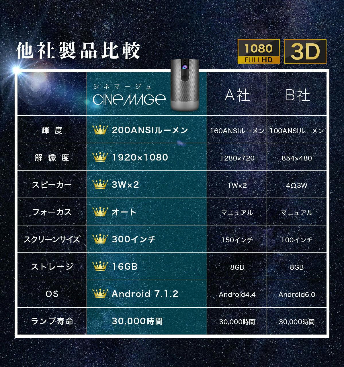 シネマージュは、持ち運び可能なサイズにもかかわらず、圧倒的な映像美と音質を実現します。プレミアムオートフォーカス機能を搭載した至高の一品です。