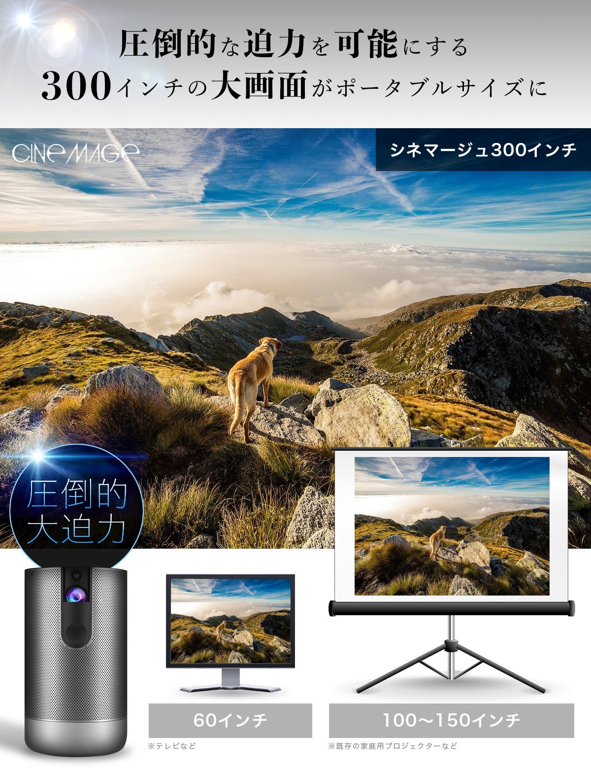 これ1台あれば、ご自宅のリビングでも寝室でも、旅行先でも10秒でその場が天空映画館へ早変わりです。これまでの家庭用プロジェクターでは100〜150インチが一般的でしたが、約2倍の画面サイズで圧倒的な迫力をあなたにお届けします。