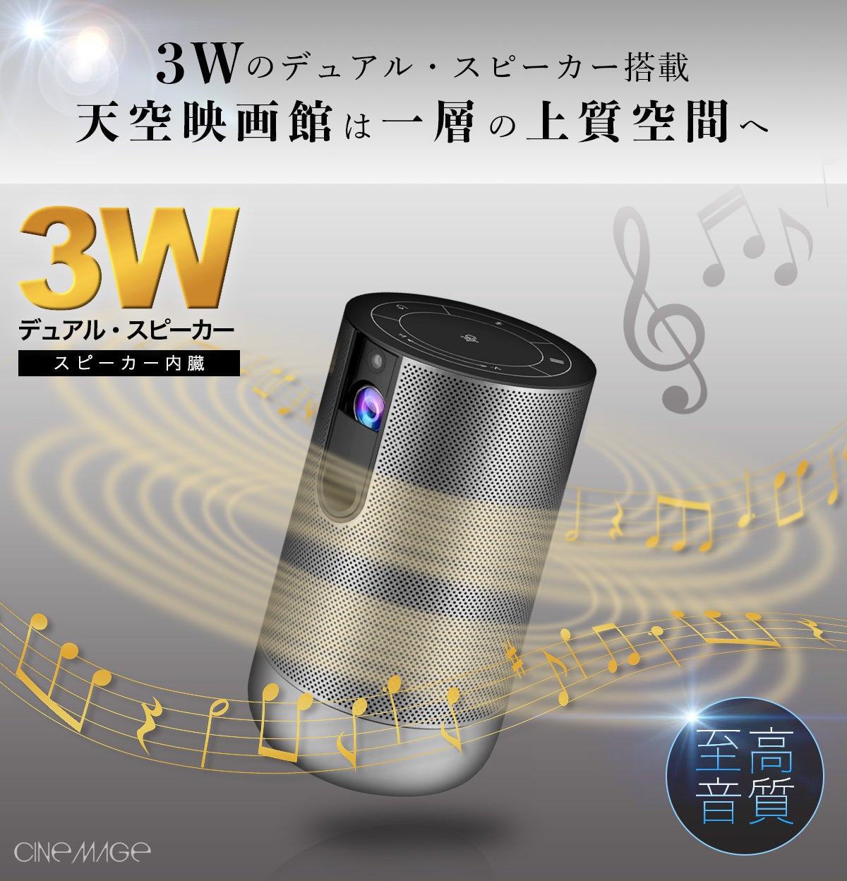 シネマージュはスピーカーが内蔵されているので、別途スピーカーを用意する必要がありません。従来のモバイルプロジェクターが搭載していたスピーカーは1Wの単一スピーカーですが、シネマージュでは、3Wのデュアル・スピーカーを搭載しております。その結果、従来のモバイルプロジェクターとは比較にならない音質を実現しております。映像だけではなく、その音質にもこだわることによって天空映画館はさらに一層上質な空間へ生まれ変わります。
