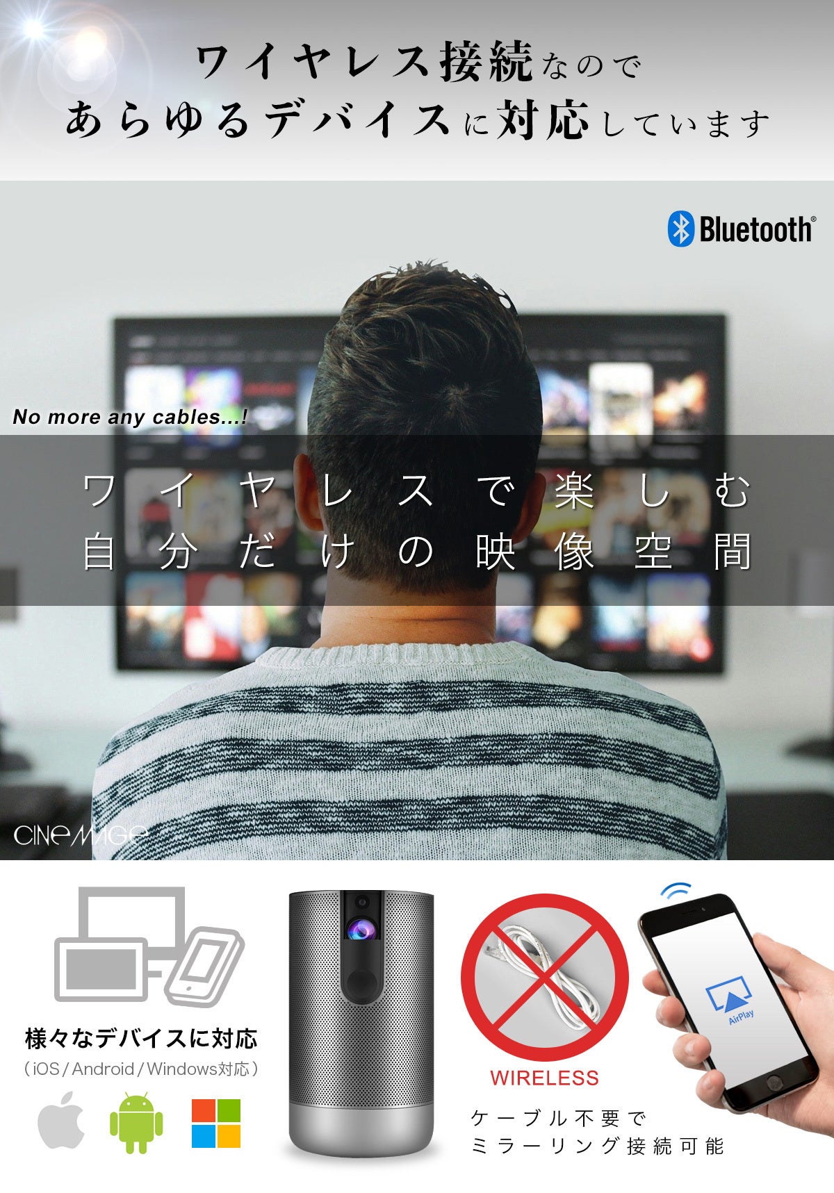 USBやHDMIを接続して映像を投影することはもちろんですが、シネマージュはワイヤレスであらゆるデバイスに接続して映像空間を楽しむ事が出来ます。