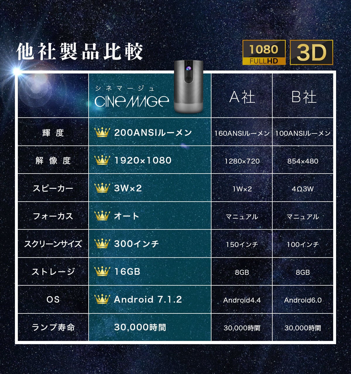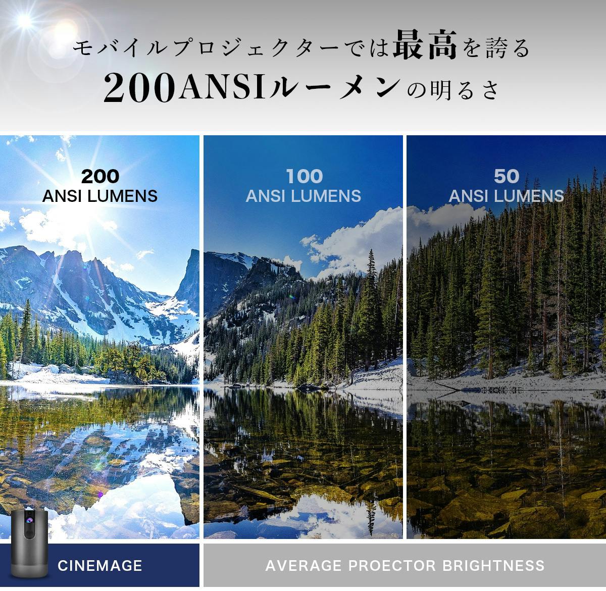 プロジェクターで投影する映像では画面サイズや画質が重要なのは言わずもがなですが、映像の「明るさ」も非常に重要です。ポータブルサイズのシネマージュですが、明るさにもこだわっていて、家庭用モバイルプロジェクターでは高レベルの200ANSIルーメンという明るさを実現しました。