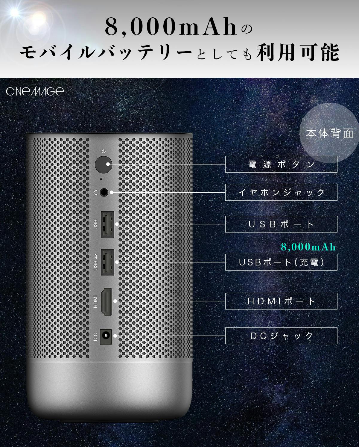 シネマージュはプロジェクターとしてだけではなく、大容量8,000mAhのモバイルバッテリーを搭載しておりますので、外出先などでスマホやタブレット等の充電をすることも出来てしまいます。