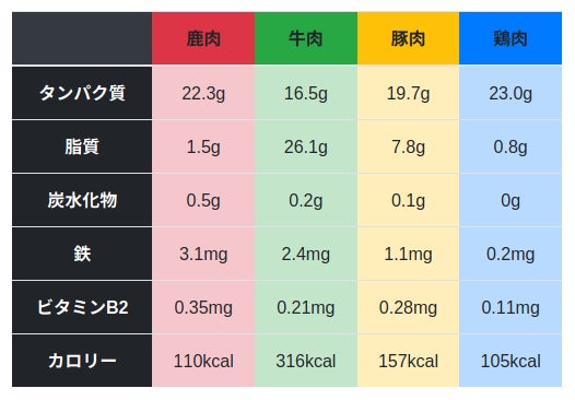 牛肉や豚肉と比べると、鹿肉のカロリーは約2分の1、脂質は約10分の1です。そのため鹿肉は別名「ヘルシーミート」と呼ばれています。最近、ペットの肥満が問題になっていますが、鹿肉はダイエットにぴったりの食材です。一方で、鉄分は豚肉の約3倍、鶏肉の15倍以上と群を抜いています。また、ビタミン類も豊富で、特に毛艶に良いビタミンB群が多く含まれています。その他、アミノ酸やミネラルをバランス良く含み、犬や猫の健康的な体づくりをサポートしてくれます。
