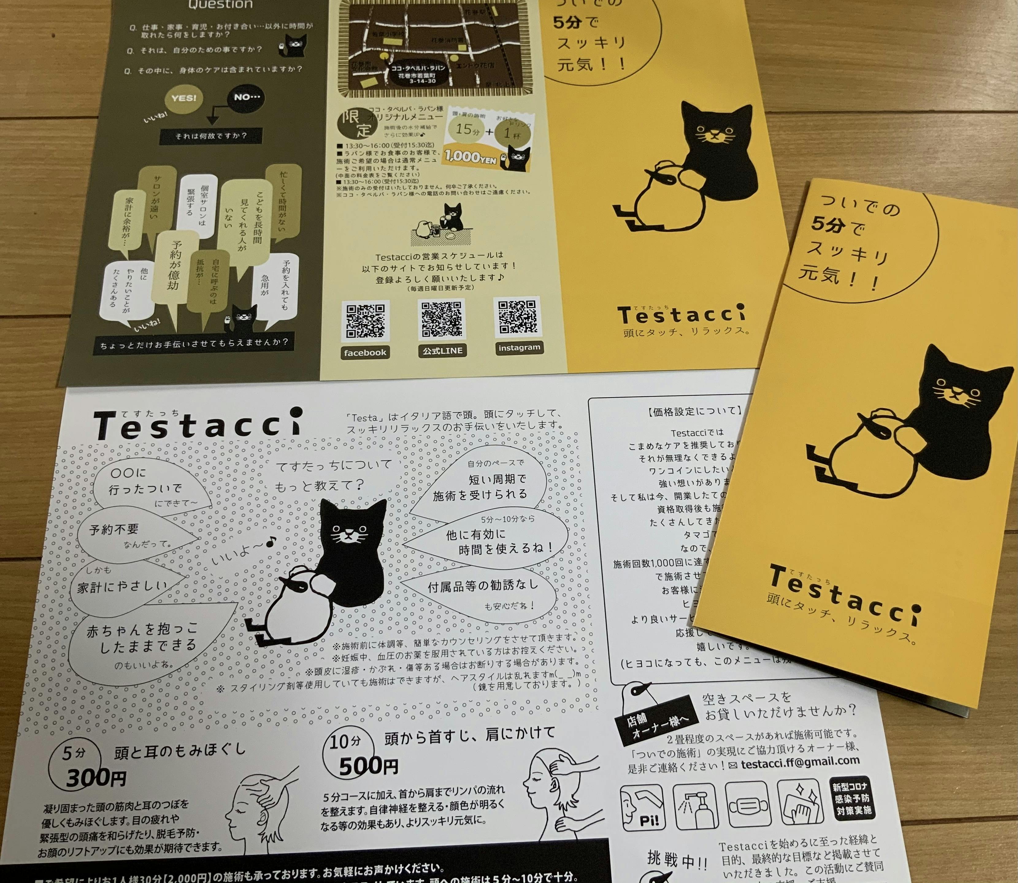この度、頭専門のもみほぐしリラクゼーションのサービスを始めたく、皆さまのお力をお貸しいただきたいとプロジェクトを立ち上げました。今年9月2日に開業届を提出し、屋号をTestacci(てすたっち)と決めました。イタリア語で頭、の意味のtestaと、触れるタッチ。頭に触れることで、元気な笑顔を増やしたいという想いで名付けました。また、ロゴには猫を。私は猫を飼っていますが、ネコが甘えてしてくるモミモミ。。。が、とても丁度良い力で癒されるのです。最初はちょっとお洒落なロゴを考えたのですが、後でも説明させていただきますが、『誰もが気軽に立ち寄れる場所』である事が私の目指しているお店なのです。なので、このイラストをロゴにしました。