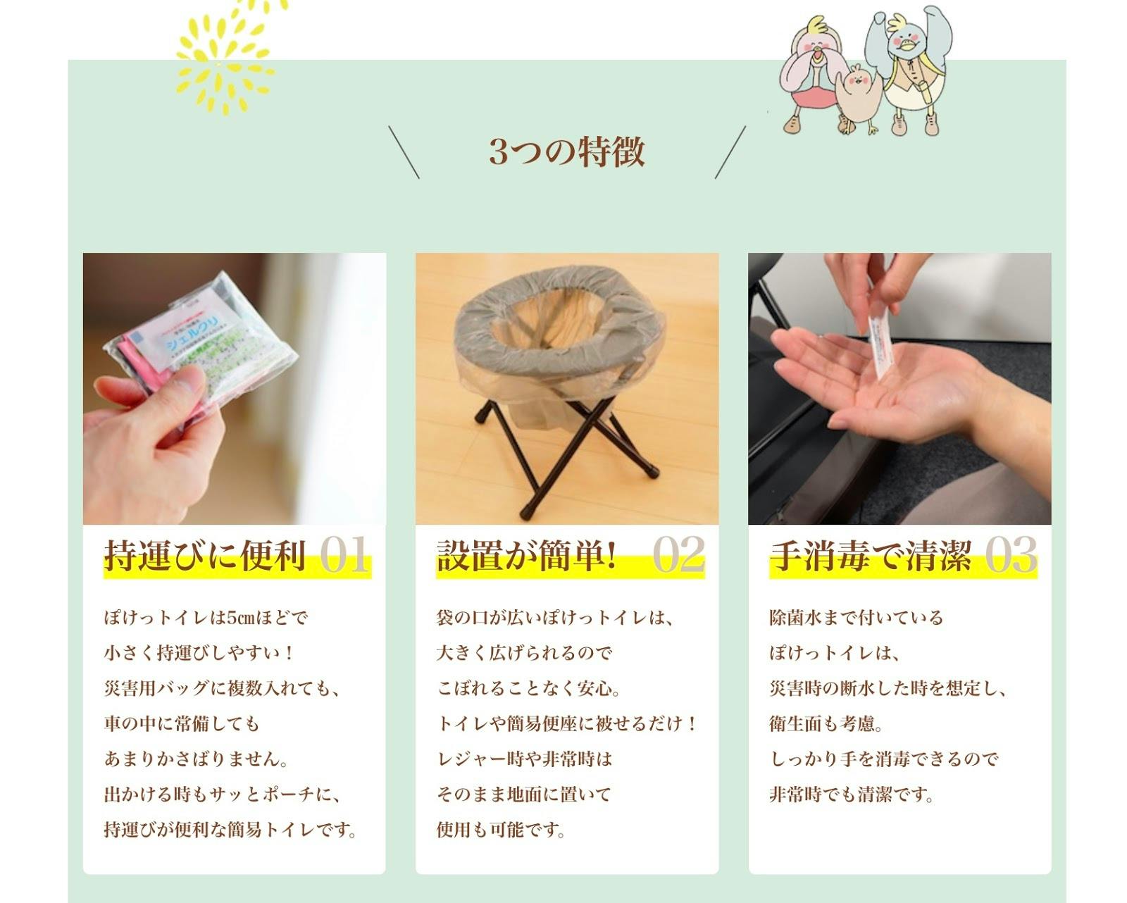 ぽけっトイレの特徴は大きく3つあります。