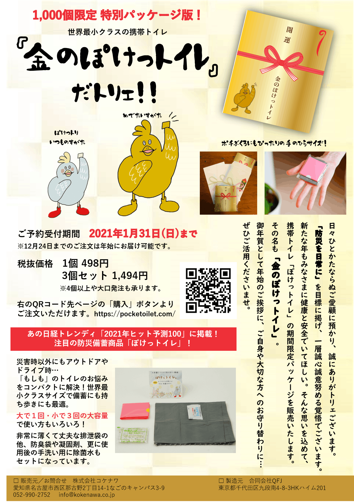 2020/12/17 15:06「ぽけっトイレ」のプロジェクトを支援してくださった皆様、お久しぶりです!その後の私たちの活動を、ご報告させてくださいね。クラウドファンディングを終えて、現在ぽけっトイレのサイトにて、一般発売を開始しております。https://pocketoilet.com/(↑こちらです!)そしていよいよ、年の瀬も迫ってまいりましたね。今年は新型コロナウイルスの影響で、年末年始も「自宅におこもり」を選択される方が多いのではないでしょうか。離れていても気持ちを伝えられるよう、大切なご両親様に贈り物をするのはいかがですか?また、新年の仕事初めには、お客様に特別なお年賀をお渡しして、喜んでいただきたい!と思うもの。お客様に「おっ、ひと味違うな!」と思っていただき、新しい一年の良いスタートを切りたいですね。そんなシーンにピッタリのお年賀商品として、なんと年末年始の期間限定!数量限定!で、「金のぽけっトイレ」を販売することとなりました。ぽけっトイレは、1つがポチ袋にちょうど入る大きさ!年始のご挨拶にピッタリです。通常はパステルカラーのイラストですが、限定商品として金色のパッケージでご用意いたしました。色々と社会不安もある近年ですが、大切な人には息災に過ごしてほしい。そんな思いを込めてお作りしております。お菓子や装飾品は人によって好みが分かれますが、防災用品、特に携帯トイレはどんな方にも必要なものです。よって、捨てられてしまう心配も少なく、いざというときには必ずお役に立つのです。あなたの真心を、「金のぽけっトイレ」と一緒に、大切な方にお届けしませんか?ご注文は、https://pocketoilet.com/の中の「購入はこちら」をクリックください。大口のご注文も承ります。12月24日(木)までにご注文いただきますと、年始に間に合うよう発送いたします。最後までお読みいただき、ありがとうございました。 もっと見る発送しました!(宛先不明分除く)