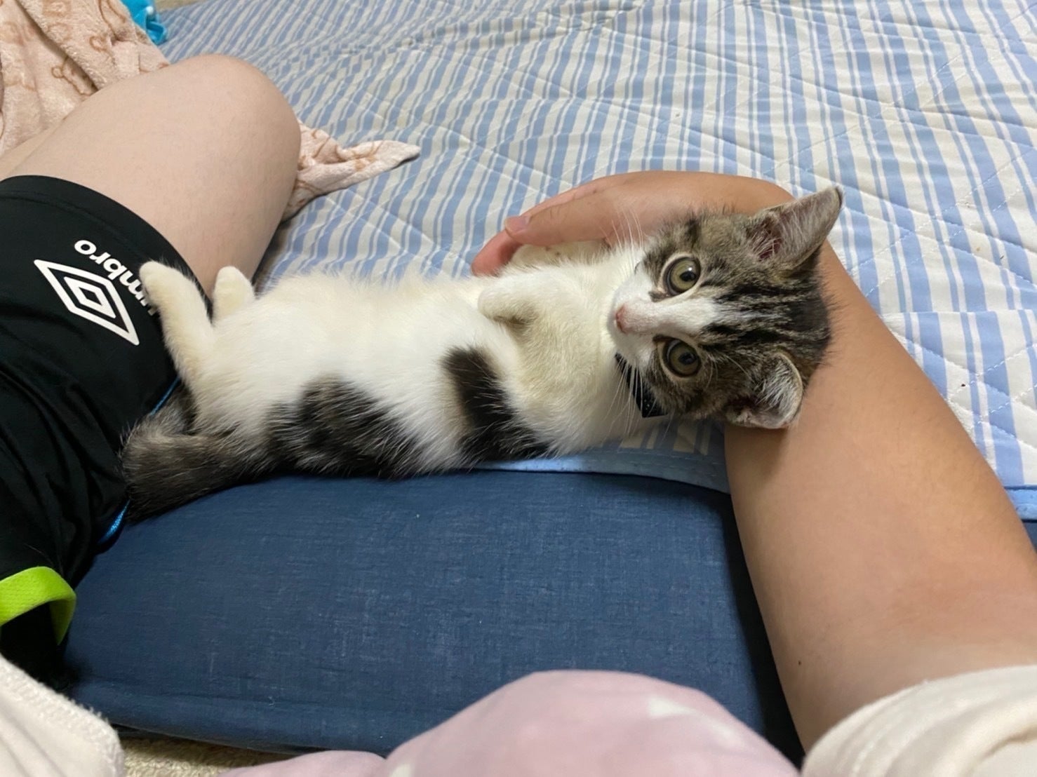 お店で初めて会ったときは他の遊び回っている猫ちゃん達と比べておとなしく、静かにこちらを見ていて、抱き上げたときも少し控えめに、小さな声で鳴いてこちらを伺っていました。