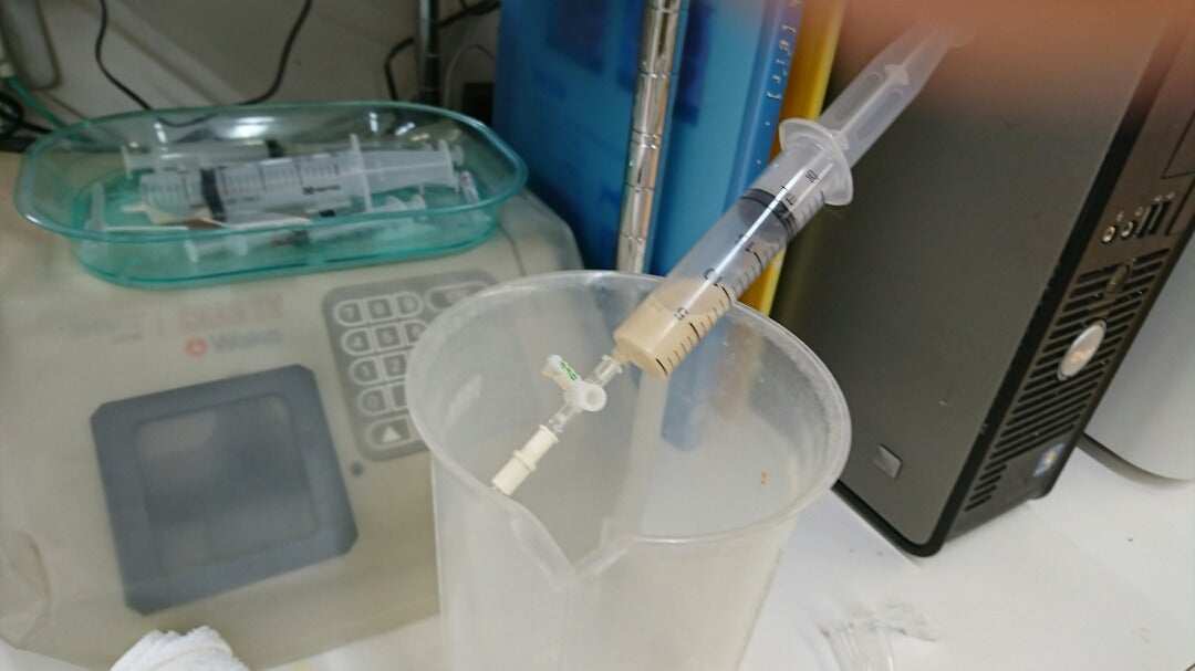 実物は、もう少し薄ピンク色でした。このカップ一杯に液が溜まりました。