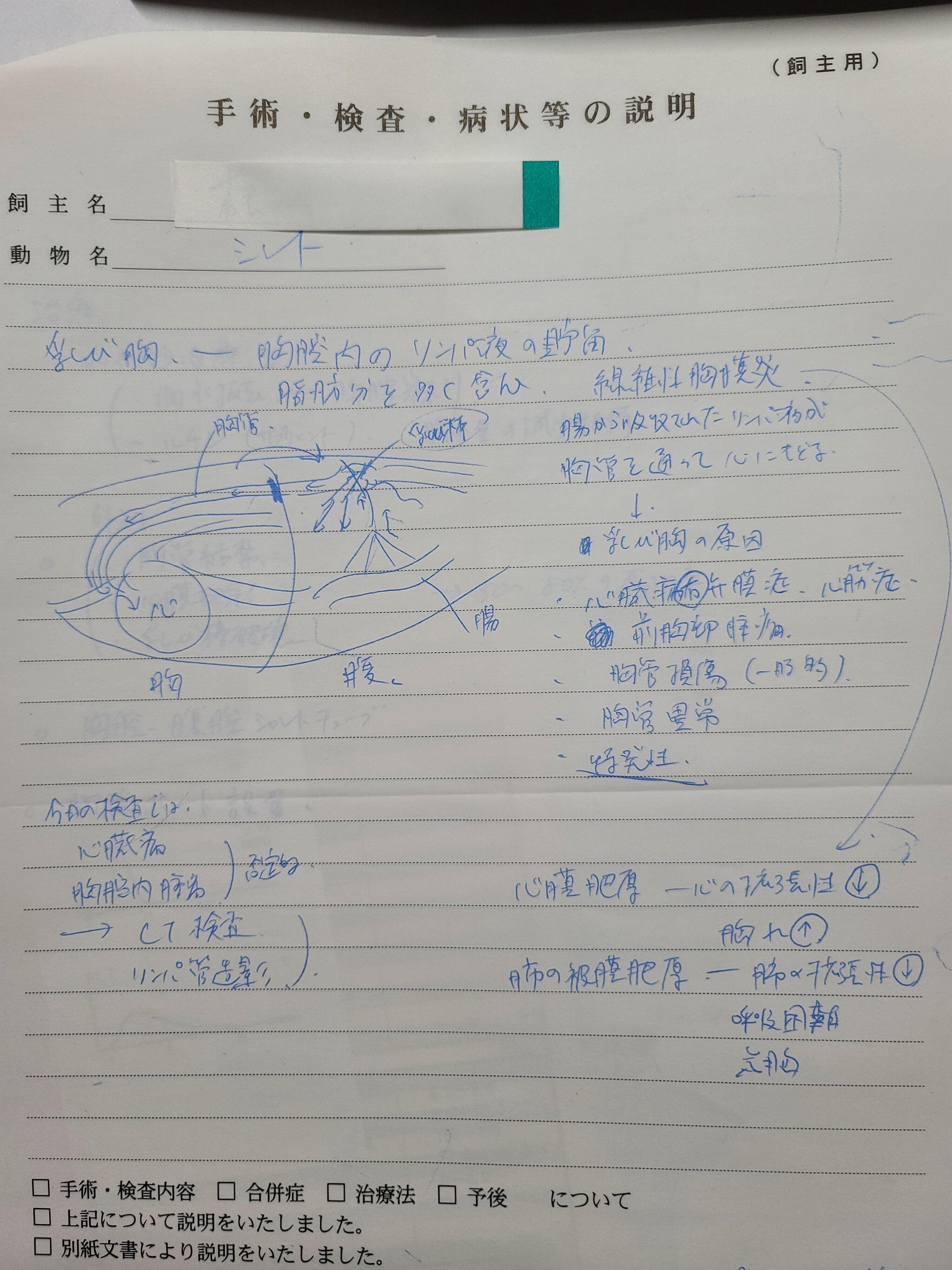 今年の8月中頃から、散歩中やけに息が荒く、ヨダレも多く、食欲も落ちてきました。毎年夏場は食欲が減る子だったので、大して気にはしていなかったのですが、エアコンを付けても息が荒く、明らかに苦しそうだったので、流石におかしいと言うことで、掛かり付けの獣医さんに診てもらったところ、乳び液がお腹一杯に貯まっていると言うことで、直ぐに抜いてもらいました。