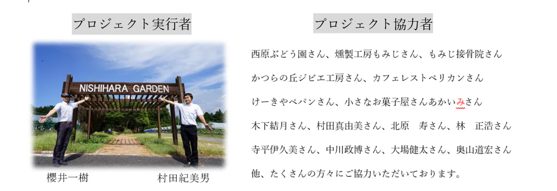 西原ぶどう園では、例年この季節にはぶどうの収穫に伴い、多くの観光客で賑わいます。しかし、この新型コロナウイルスの影響で観光客が激減する見込みです。ここで少しでも応援したい。そして、この自然が溢れる地をより多くの方に知ってもらい、未来を創る為に思い立ちました。
