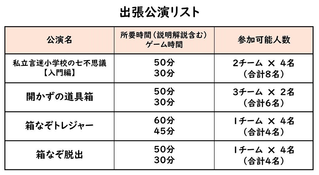公演内容は、出張公演リストにある箱なぞ公演の中からの選択となります。