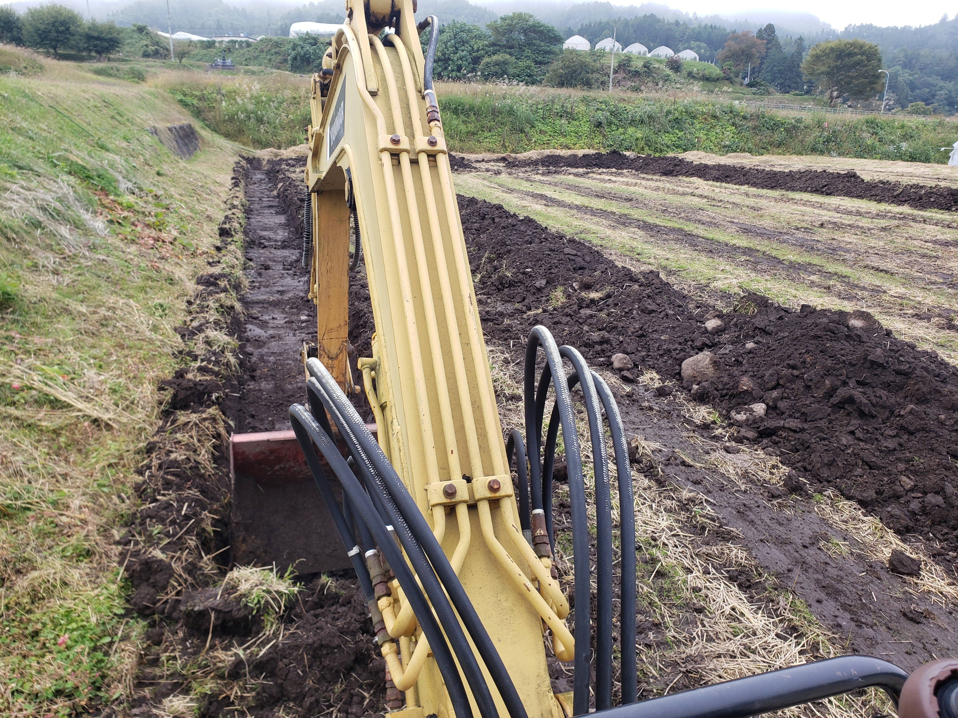 ハウスを建てる予定の区画の回りにバックホウで溝を掘っています。雨水を排水するためのものです。ハウスを建てると後から工事しにくく、年数がたつと徐々に浅くなっていくので、あらかじめなるべく深めに、大きめに掘ります。今のところ、大きな石は少なめなようでひと安心です。石が多いとハウスの骨を突き刺すのに大変苦労します。あるにはありますが。。。