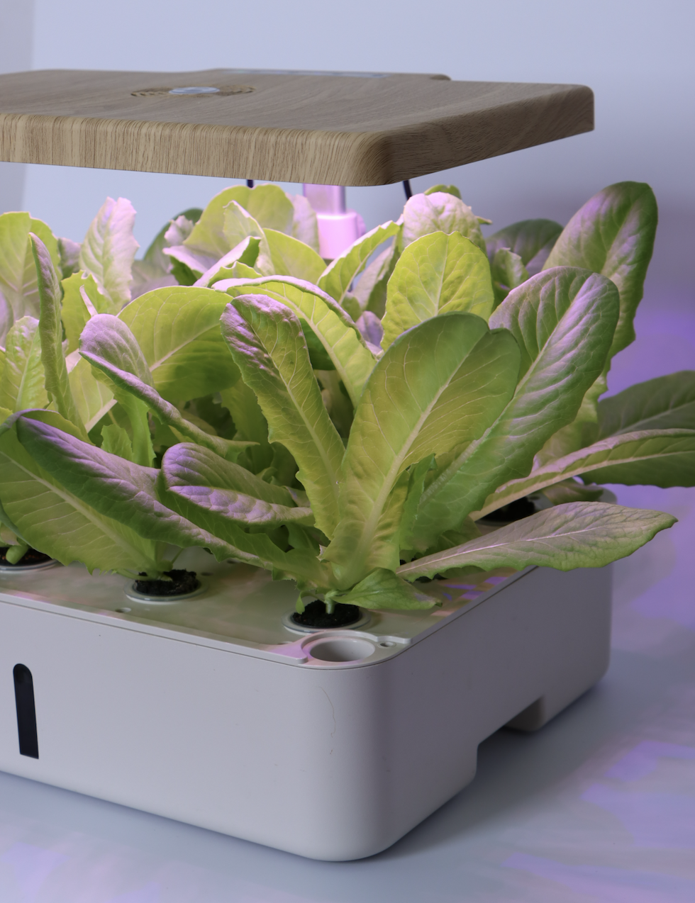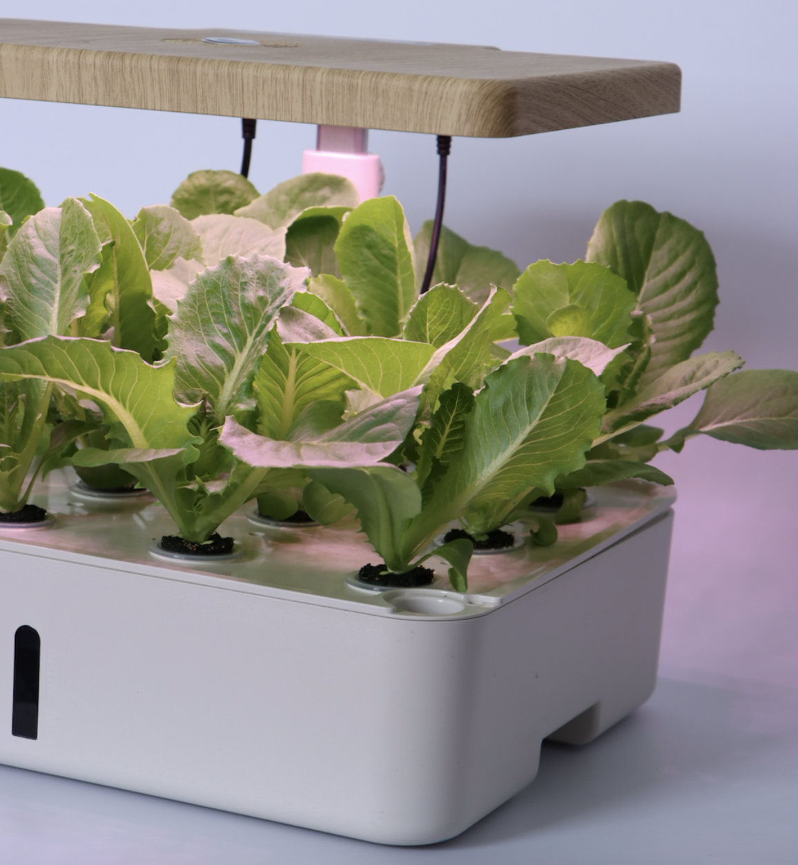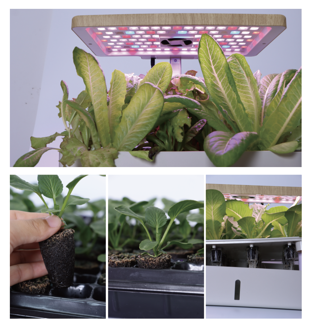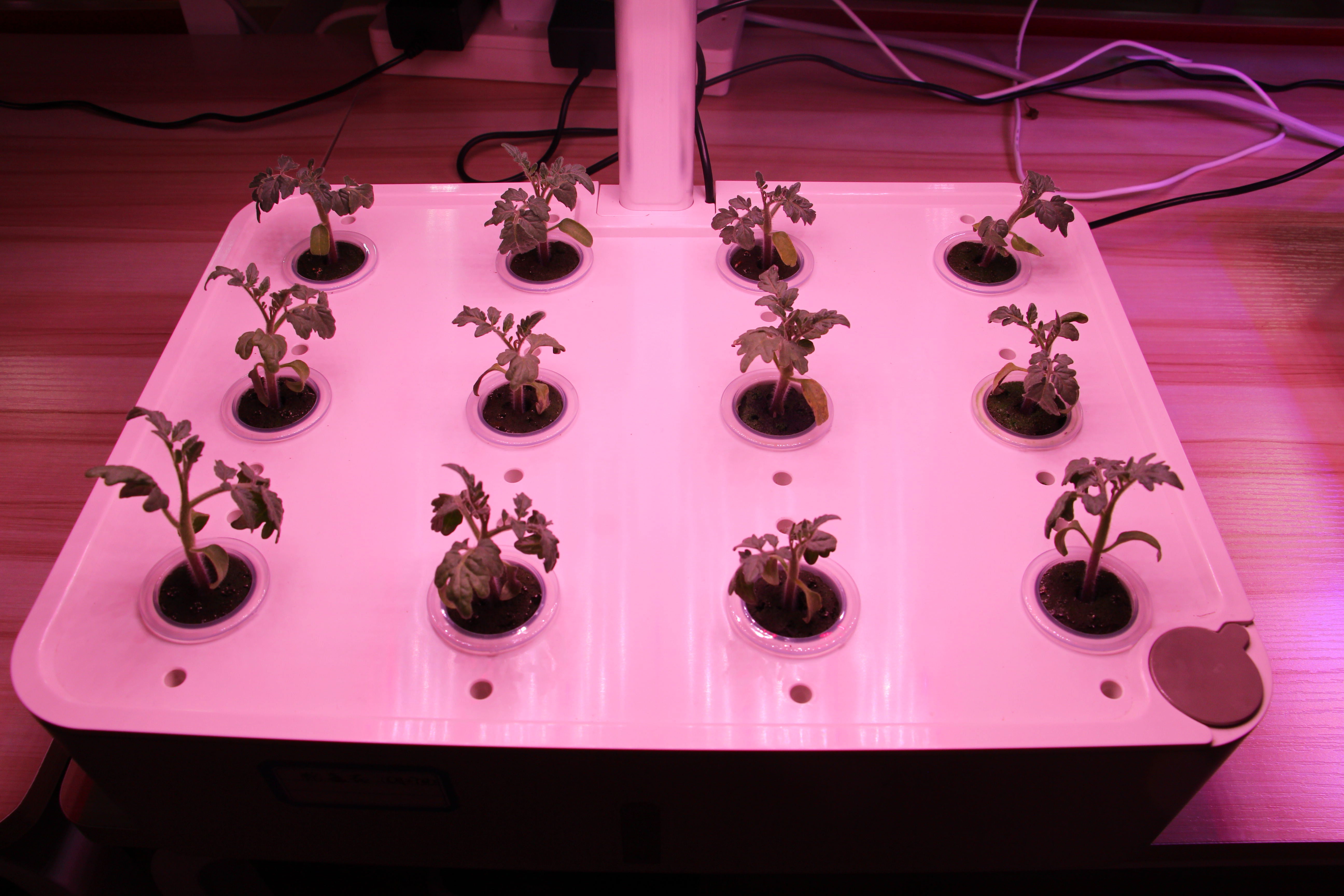 E:苗が発芽したら、ベジタブルモードかフルーツモードを選択してライトをオンにし、ライトパネルを最も低い位置に調整します。
