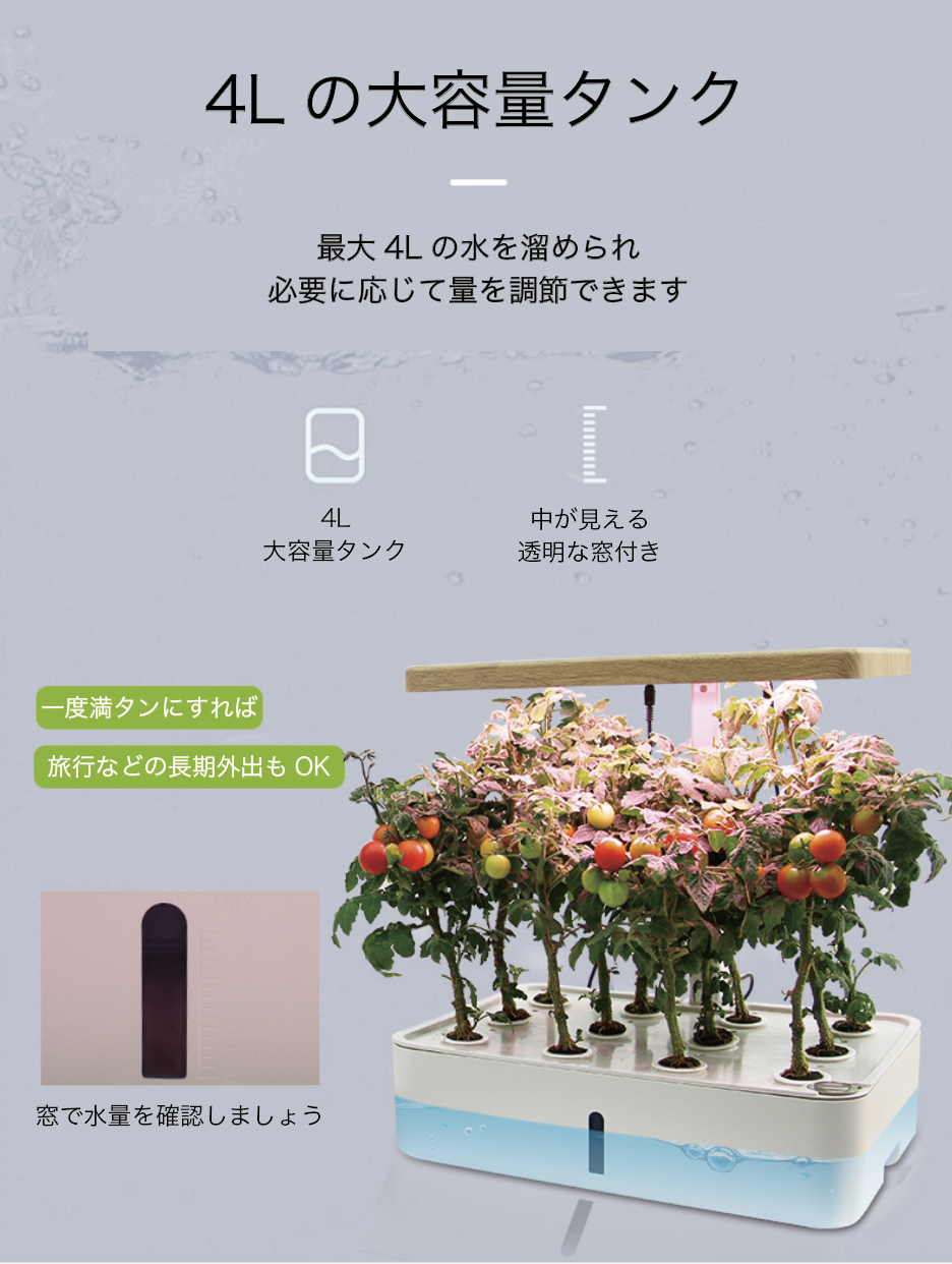 16時間の連続運転後に自動消灯の機能付き。植物の生長に合わせて自動管理できます。急な出張や海外旅行で家を空けても心配なし!