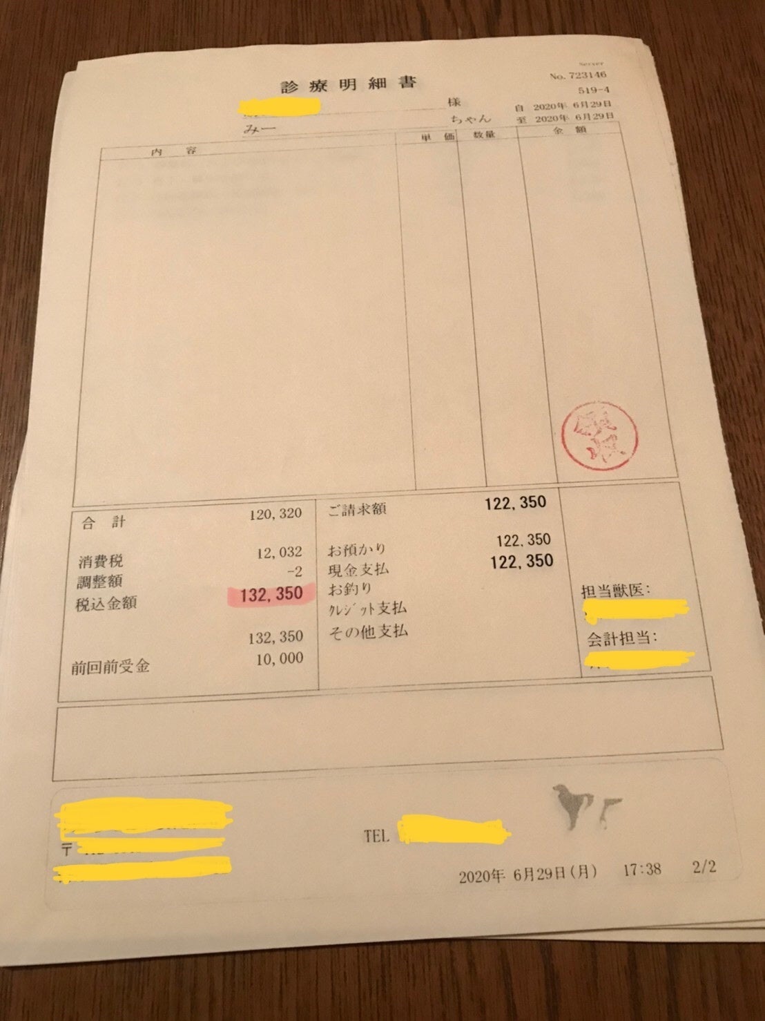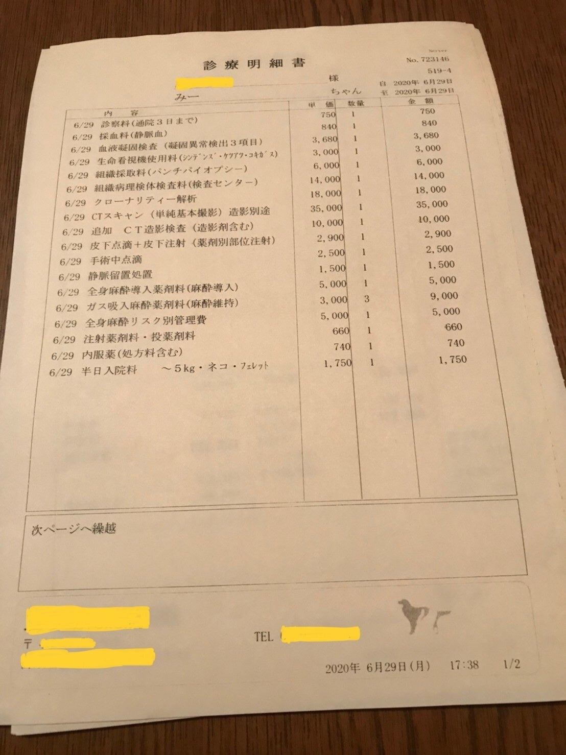 みーの麻酔によるガン細胞の採材と検査後の姿 抗がん剤治療に入るまでの6月14日〜6月29日で総額195,570円かかりました。