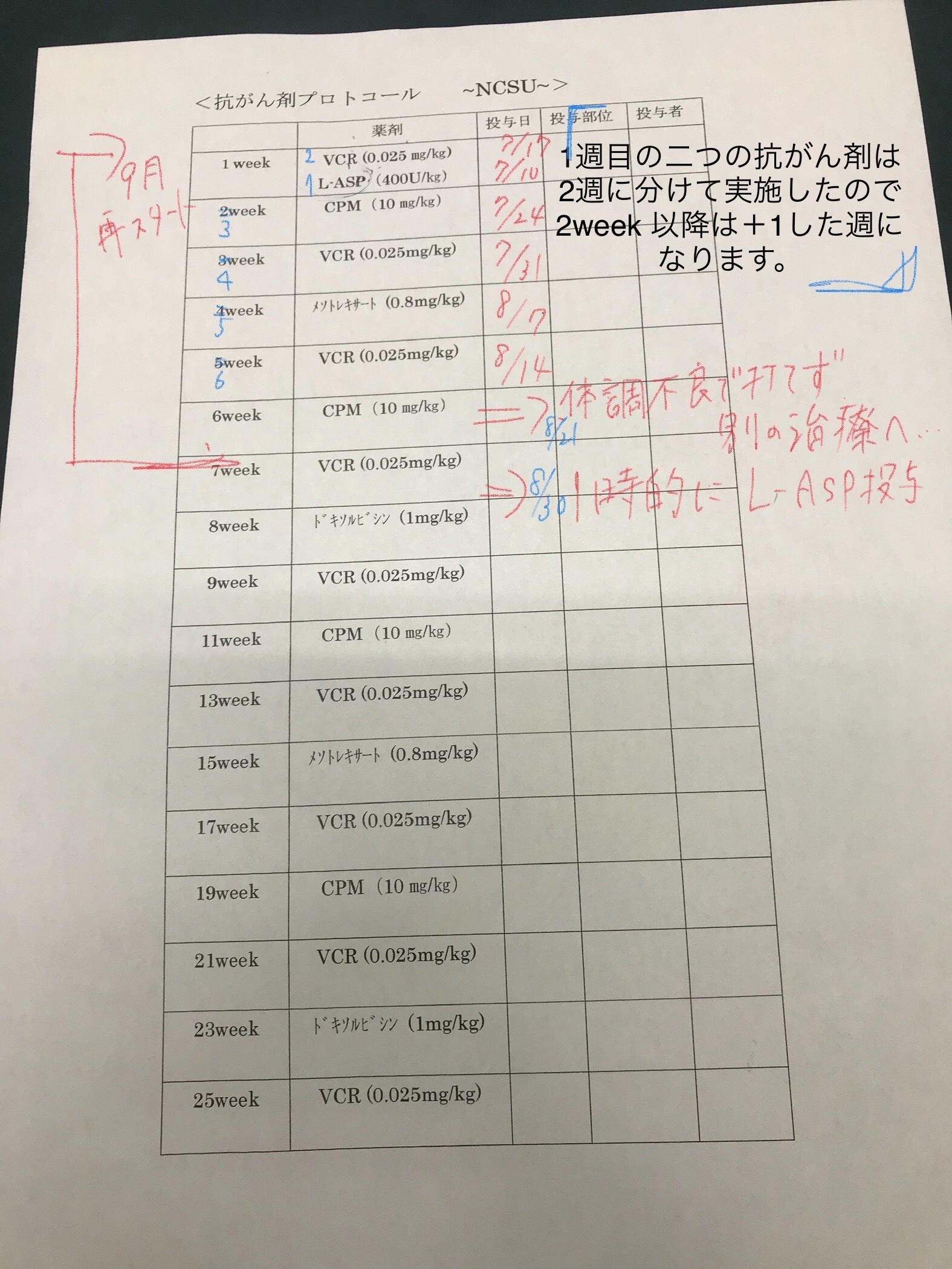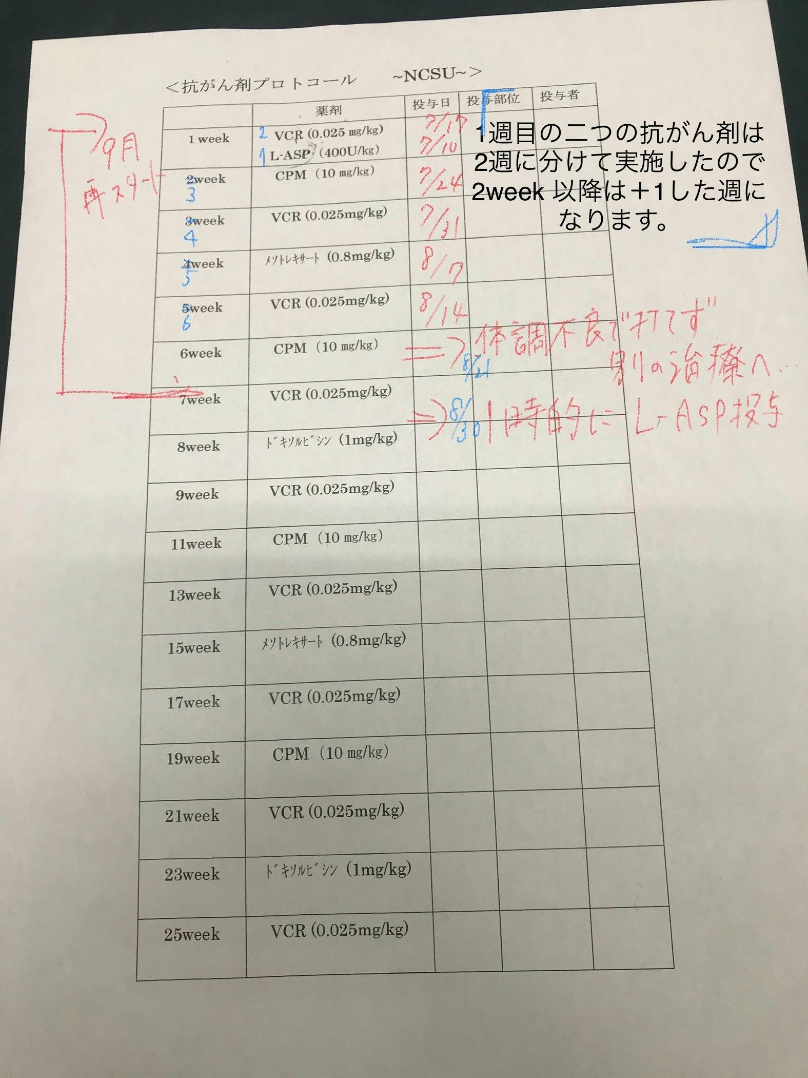 そしてプロトコルの予定に従って7月より徐々に抗がん剤治療がスタートしました。プロトコル表にざっくりではありますが治療日時を記載しました。