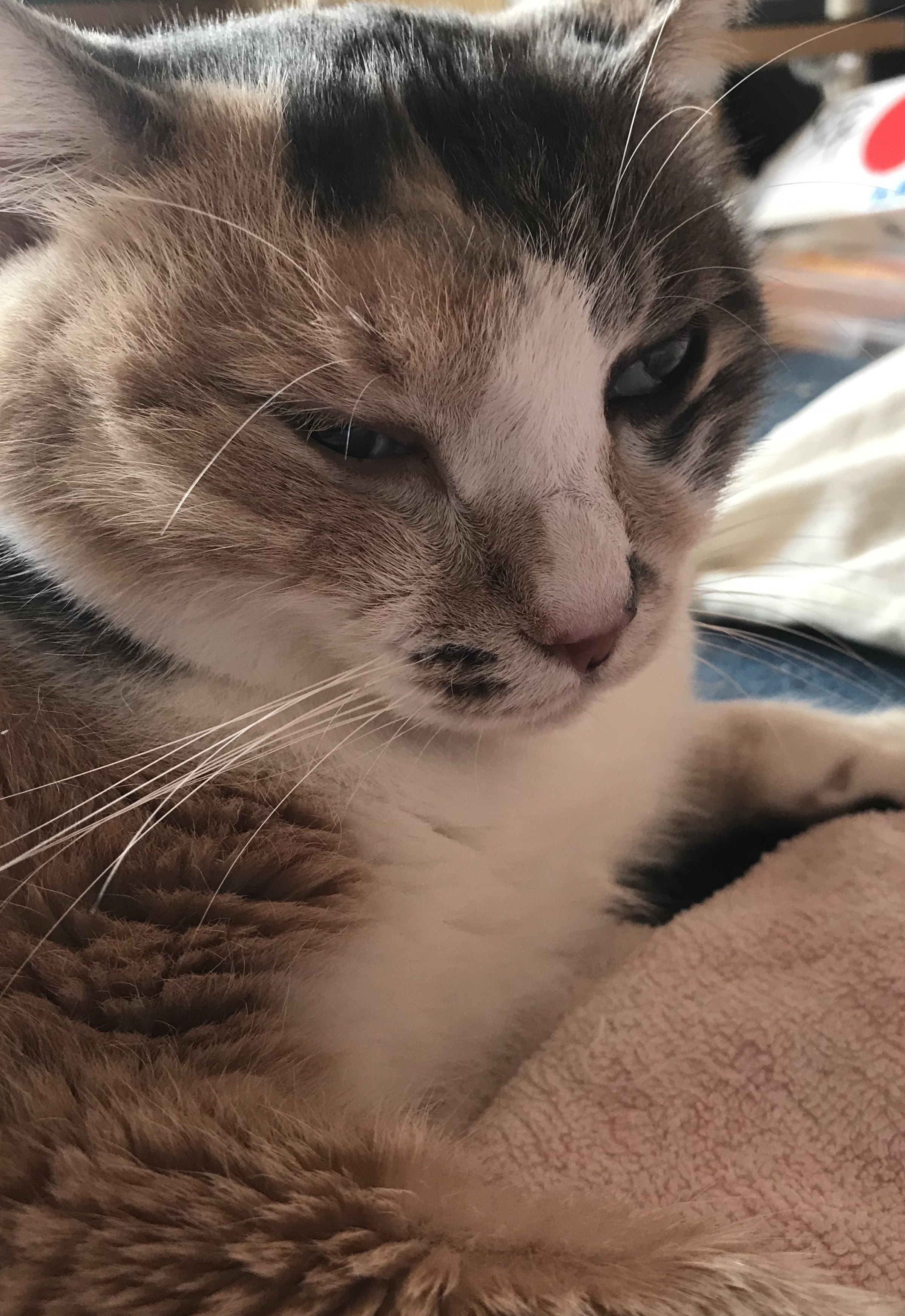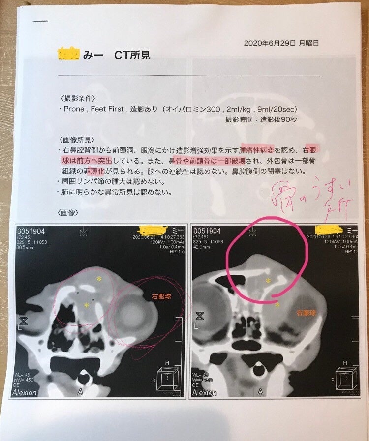 みーの様子がおかしいと思ったのは今年6月のこと。くしゃみが酷く、額は腫れ、右目は飛び出し涙を流している。急いで病院へ行き、直ぐに検査になりました。そしてリンパ腫が判明しました。クロナリティーやCT等の詳細な検査結果を母と聞いた時は動揺とショックで若干パニックだったと思います。腫瘍のできた場所が頭部・鼻腔で、頭蓋骨が溶かされ薄くなり、溶けた骨が額の方に流されて固まり変形しているとのことでした。このまま進行すると脳に到達してしまうとも言われすぐ治療を開始しました。変形した箇所は戻ることはないらしく、抗がん剤治療は猫の身体的にも苦痛を伴うことですが、うまくいけば寛解し、運が良ければ頭蓋骨の骨も厚くなると言われました。みーに辛い思いをさせることはとても悩みましたが、できるだけの治療・快適な生活のケアをして、寛解を信じてポジティブに頑張る決意を私達はしました。
