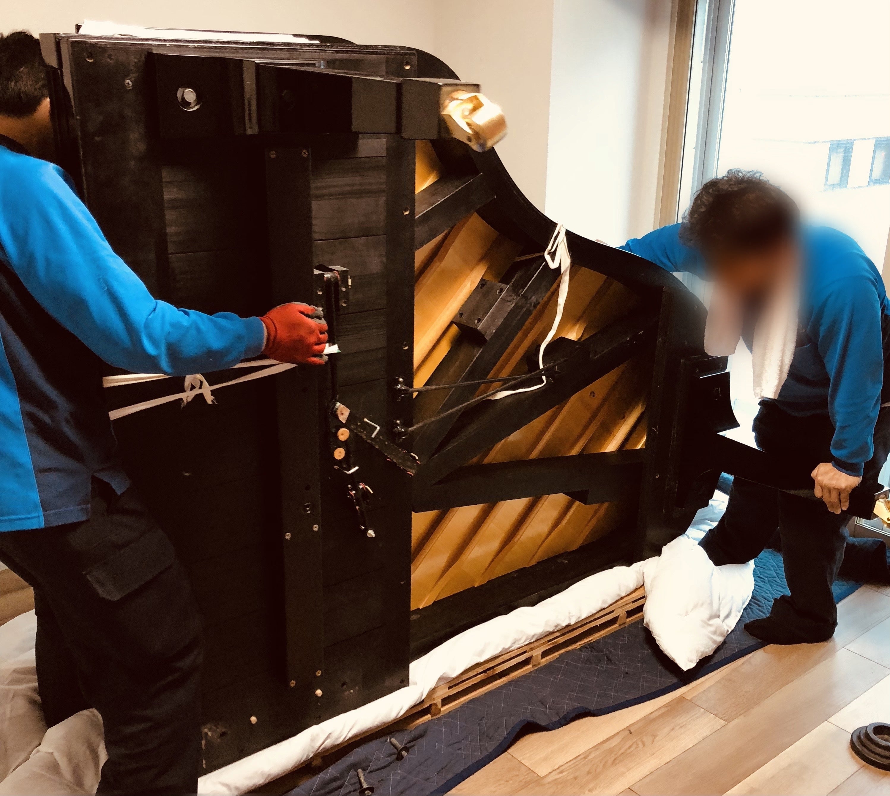 ↓グランドピアノの足を外し、ピアノを傾けている状態です。