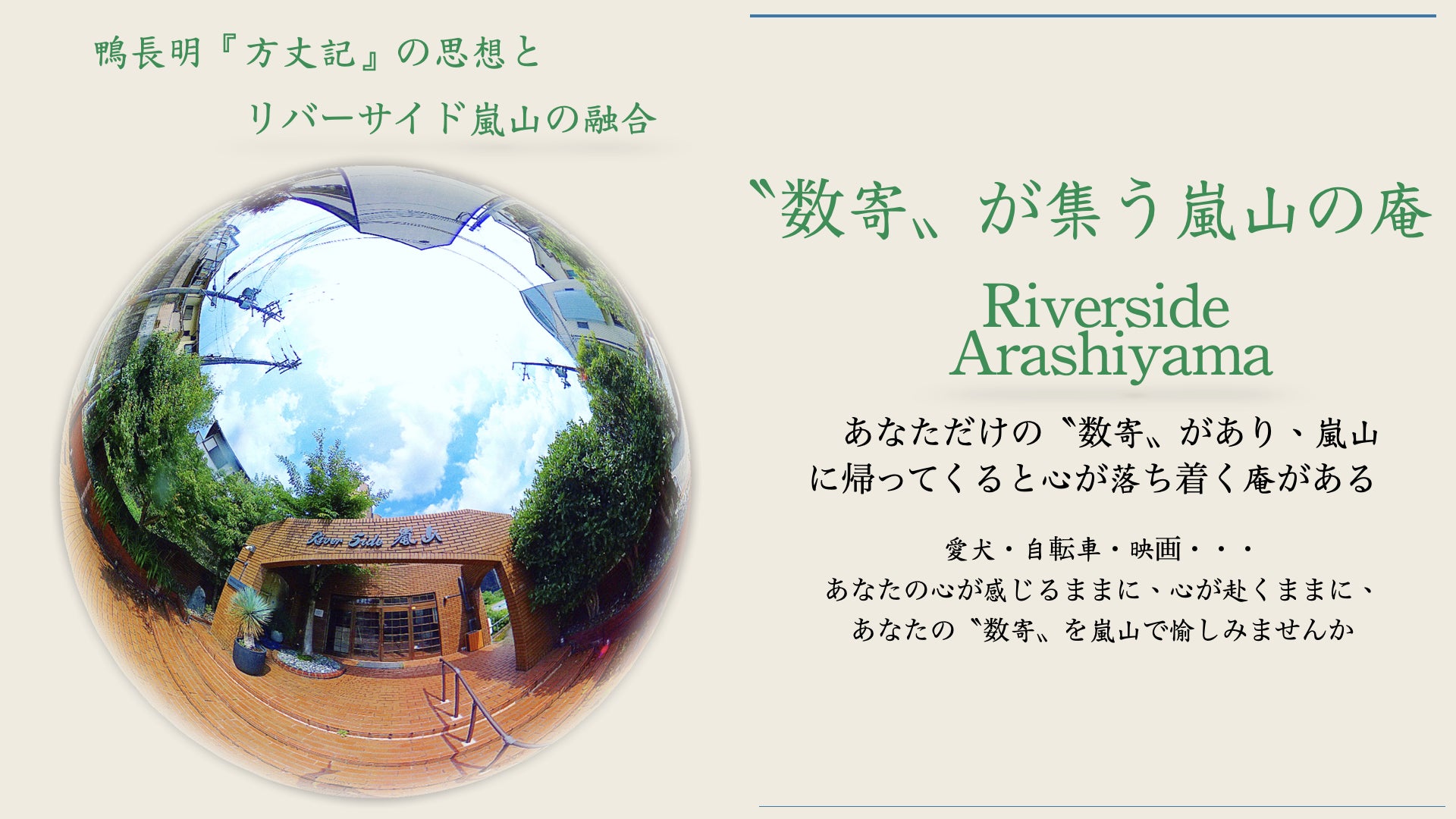 当館『Riverside嵐山』は京都嵐山でお客様をお迎えしておりましたが、新型コロナウイルスの影響により嵐山においても観光、宿泊のお客様が激減したために経営が悪化し今年の5月から閉館せざるを得ない状況になりました。しかし、いつまでもこのままではいけないという気持ちと、『嵐山』の素晴らしい自然と歴史の魅力をもう一度皆様にお伝えしたいとの思いからリニューアル再オープンすることになりました。