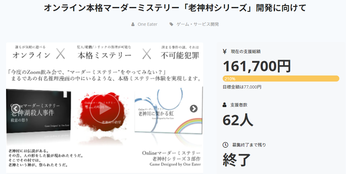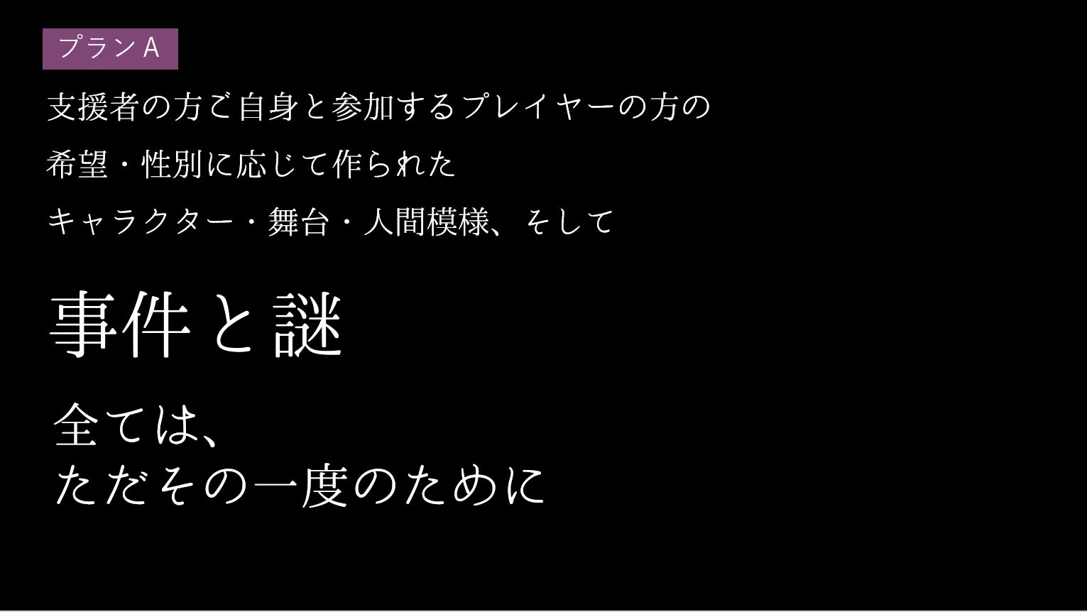 上記前プロジェクトを通して、本当に多くの方にマーダーミステリーを遊んでいただきました。制作者として大変感謝申し上げます。