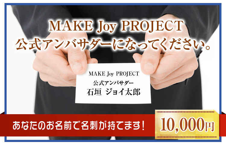 プロジェクトの公式名刺を一人一人に100枚ずつ作成してお渡しします。MAKE Joy PROJECTの公式アンバサダーとして、広報活動をお願いいたします。